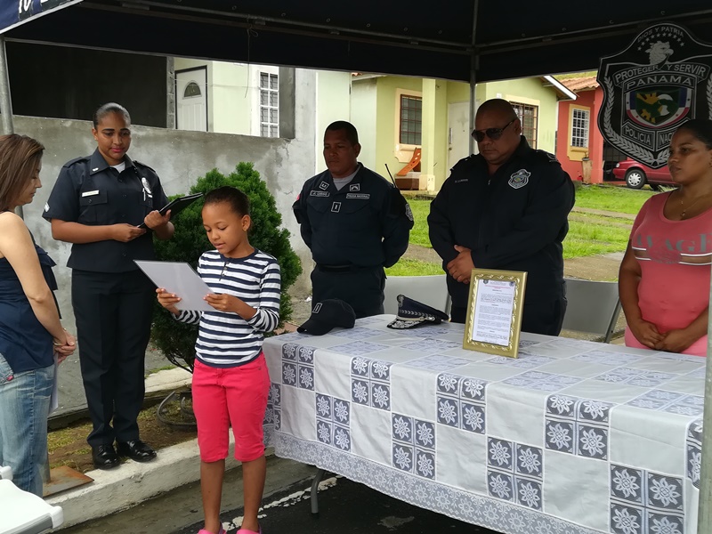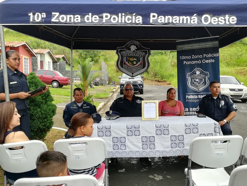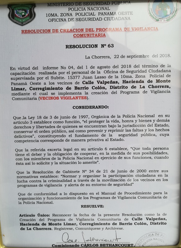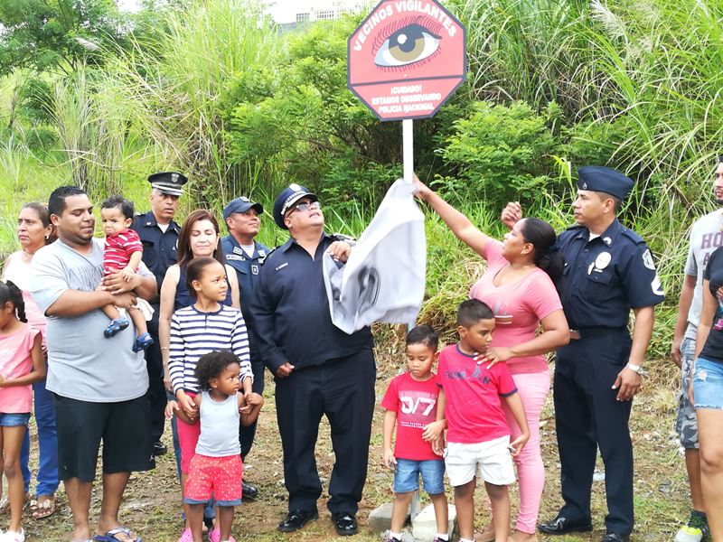 Calle Valpeña en Hacienda Montelimar, corregimiento de Barrio Colón en el distrito de La Chorrera, se integró a los programas preventivos que desarrolla el personal del Servicio de Seguridad Ciudadana, convirtiéndose en el programa número 63 de Vecinos Vigilantes. Se trata de 18 familias quienes recibieron la capacitación por parte de las unidades policiales y se comprometieron de manera voluntaria a ser vigilantes de los problemas que les atañe como comunidad y a trabajar en coordinación con las unidades de la Policía Nacional para evitar situaciones delictivas en su sector. El acto inaugural contó con la presencia del Comisionado Manuel Llorente ejecutivo de la Zona, quien hizo entrega de la Carta Compromiso a la coordinadora principal del programa señora Iris Godoy, que posteriormente procedieron al ritmo de la murga institucional a develar el letrero que los identifica como nuevos miembros de los programas de Vecinos Vigilantes.