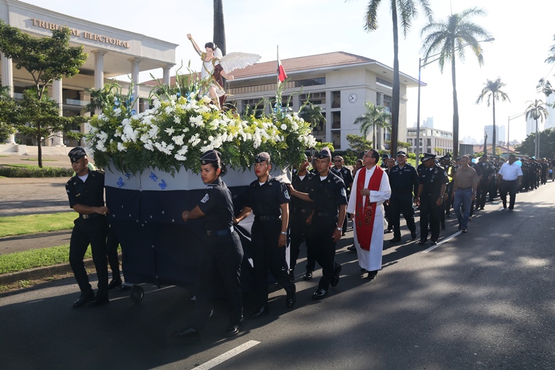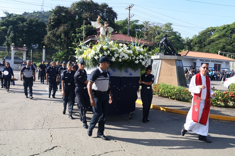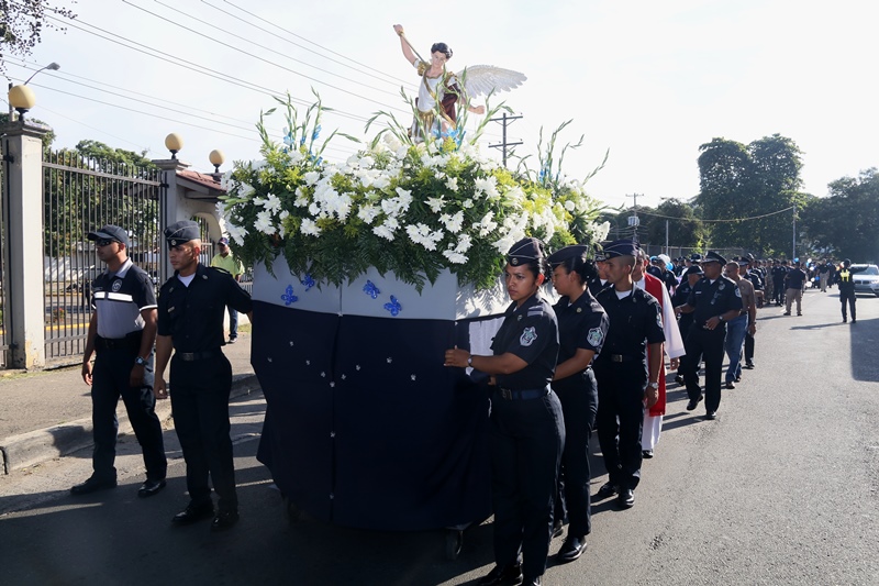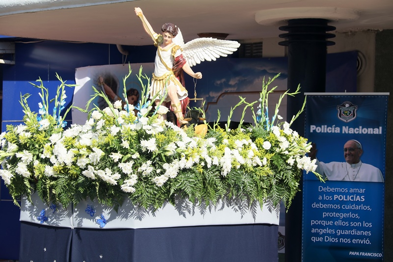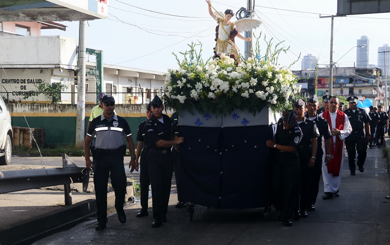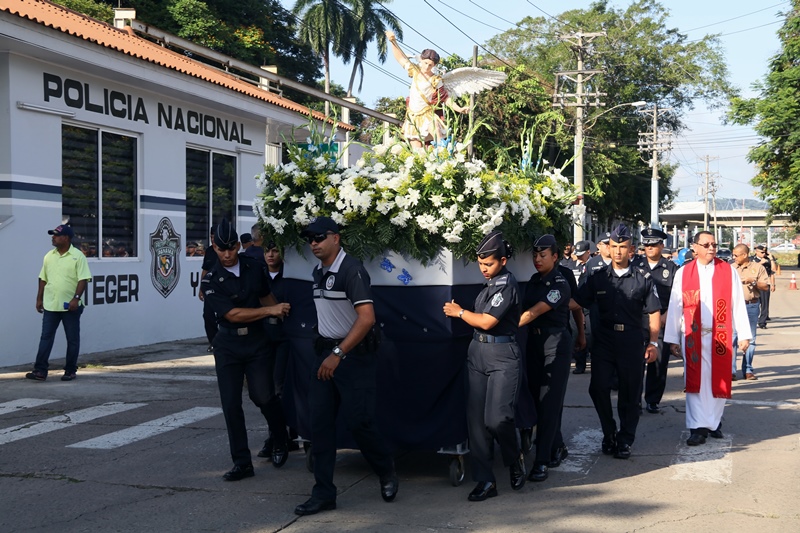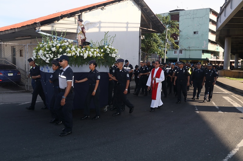 “El papel de San Miguel Arcángel es el papel que hace la Policía Nacional, nosotros somos los guardianes de los ciudadanos”, destacó el Director General de la Policía Nacional, Alonso Vega Pino durante la misa en honor al patrono y protector de los uniformados “San Miguel Arcángel”, que se desarrolló en la sede de la institución en el corregimiento de Ancón. La familia policial está de fiesta patronal. Honró hoy a San Miguel Arcángel, patrono de la Capilla que lleva su nombre, motivo por el cual se realizó una procesión, misa, entrega de canastillas, y obsequios a los presentes. El Director General de la Policía Nacional, Alonso Vega Pino junto al Directorio, y miembros de otros estamentos de seguridad, encabezaron la procesión que partió en horas de la mañana desde la subestación policial de San Miguel, este sábado 29 de septiembre de 2018. La Eucaristía fue presidida por el obispo Pedro Hernández Cantero, y los capellanes Edgar Flores y Arnulfo Giménez, a la que acudieron hijos de unidades policiales quienes están recibiendo clases de catequesis, para posteriormente realizar su Primera Comunión y Confirmación, además de otras personalidades que nos honraron con su presencia. El Pedro Hernández Cantero hizo énfasis en el trabajo que realizan las unidades policiales como un compromiso de todos, los instó a seguir trabajando por la seguridad y tranquilidad de los ciudadanos. San Miguel Arcángel se le considera como el Patrón de los soldados, las unidades policiales se encomiendan a él en cada labor realizada a lo largo y ancho del país.