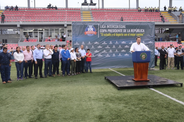 El mandatario Juan Carlos Varela inauguró en el Estadio Maracaná, El Chorrillo, la cuarta versión del Torneo Intercolegial de Fútbol “Copa Presidente de la República”, en el que participan 48 equipos en las categorías sub-15 y sub-18. “Ha sido para mí un honor llevar este torneo desde el año 2015 cuando se creó para enriquecer la vida del estudiante mediante el deporte. En estos cuatro años hemos comprobado que el estudio y el deporte son el mejor camino”, destacó el Presidente. La Copa Presidente es producto de una coordinación interinstitucional de la Policía Nacional, MEDUCA y Pandeportes, siguiendo los lineamientos del Plan de Gobierno de Convivencia Pacífica, que busca la confraternidad de los jóvenes a través de una actividad sana. El jefe del Ejecutivo consideró que este evento deportivo intercolegial se ha convertido en uno de los más esperados, pues trae consigo ventajas y beneficios para los estudiantes y para sus familias, que los acompañan durante todo el torneo. Instó a los jóvenes a transmitir en la sociedad todos los valores que aquí obtienen: la disciplina, el respeto, el trabajo en equipo y la puntualidad y les aseguró que estos juegos contribuirán a su formación personal, fortalecerán su carácter, su espíritu de grupo, su disciplina y también su desarrollo físico. “Todo esto forma un excelente estudiante, y un gran profesional para el futuro”. El juego inaugural se lo disputaron la Escuela Profesional Isabel Herrera de Obaldía y el colegio El Zapallal. Los partidos, que se extenderán hasta el 1 de noviembre, se jugarán en cinco estadios del país: Bugaba, en la provincia de Chiriquí; Los Milagros, en la provincia de Herrera; Agustín ‘Muquita’ Sánchez, en la provincia de Panamá Oeste, Maracaná y Luis Ernesto ‘Cascarita’ Tapia en la ciudad capital.