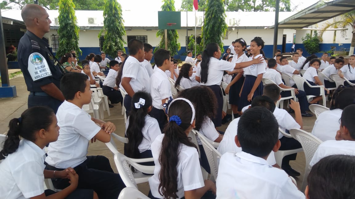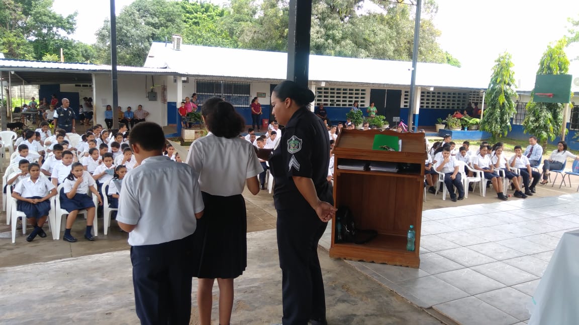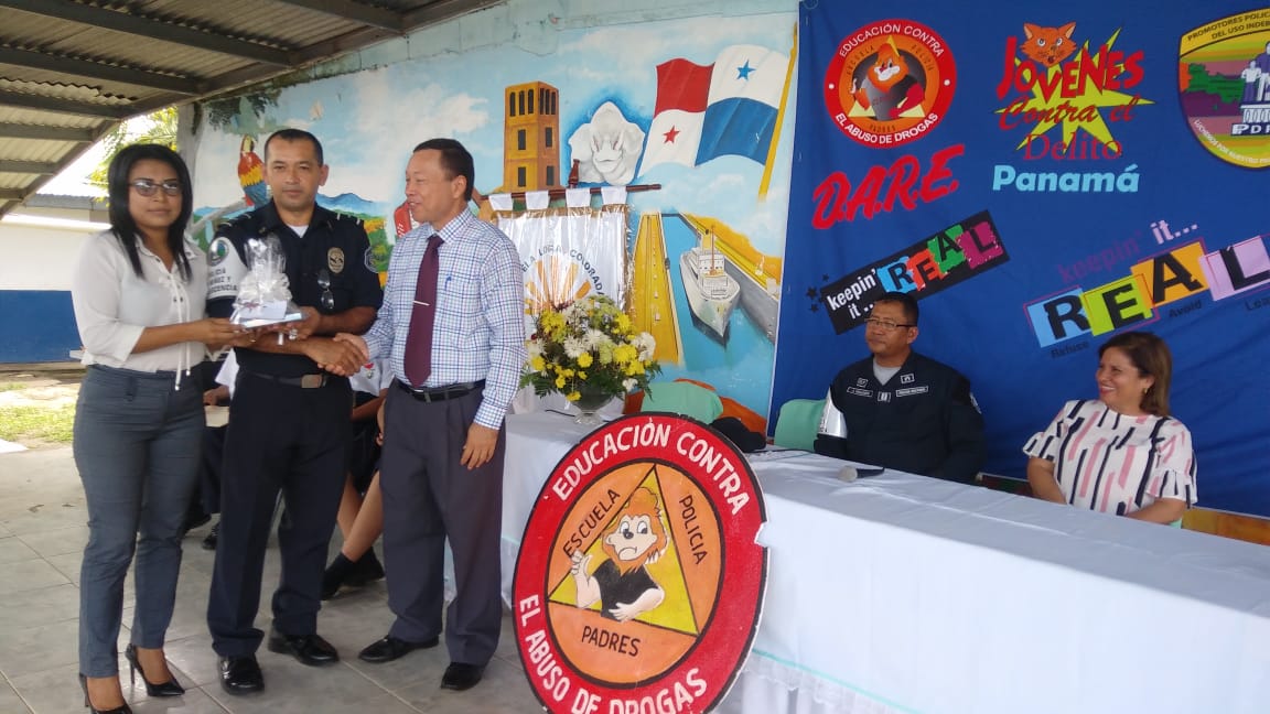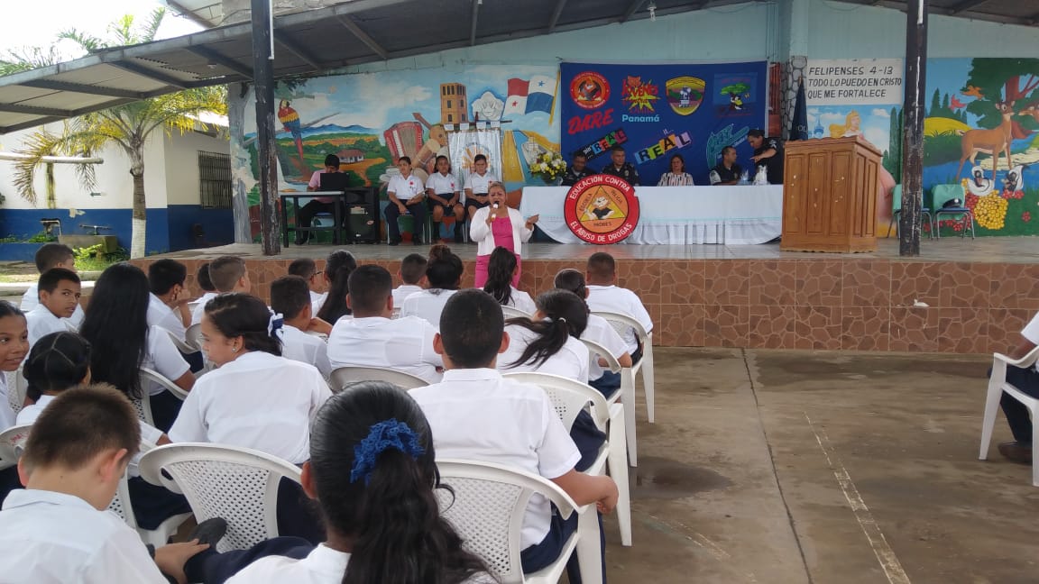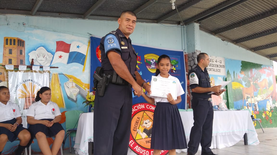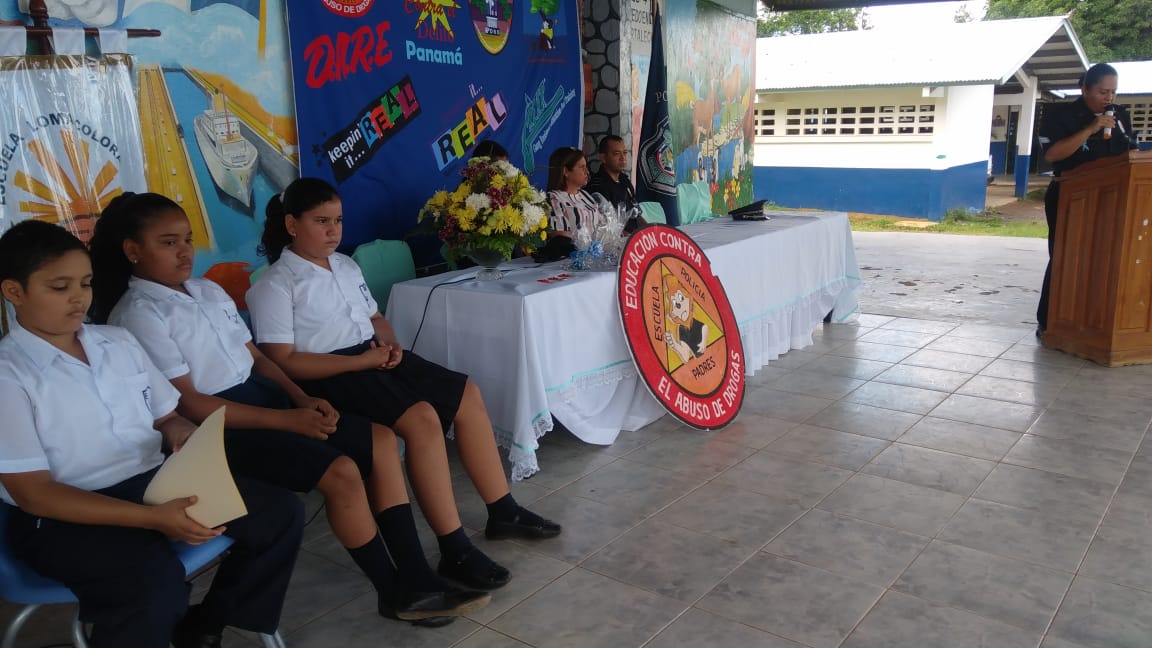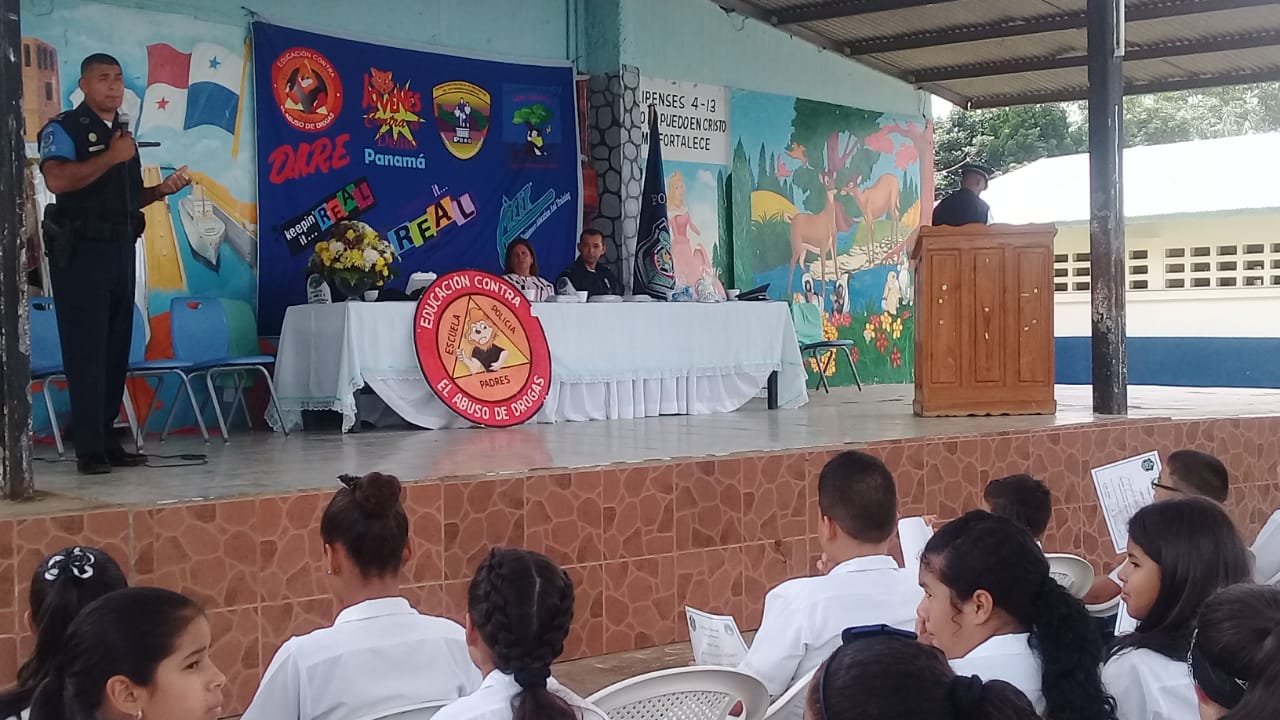 En la Escuela Loma Colorada de la ciudad de David culminó el programa que desarrolla el Servicio de Policía de Niñez y Adolescencia, conocido por sus siglas en inglés, D.A.R.E., que significa Educación para la Resistencia al Abuso de Drogas y Violencia. El programa D.A.R.E. tiene como objetivo proporcionar información a niños y jóvenes sobre los efectos nocivos de las drogas y la violencia para mantenerlos alejados de los vicios y las pandillas. Los beneficiados fueron unos 184 estudiantes de 5to. y 6to.grados. La Profesora Angélica Checa, directora de la escuela, agradeció a la Policía Nacional por este tipo de programas que ponen en práctica en diferentes centros educativos de la provincia. “Felicito al Teniente Jorge Gallardo, encargado del Servicio de Policía de Niñez y Adolescencia en Chiriquì, y al instructor del Programa D.A.R.E. Subteniente Porfirio Jaramillo, por capacitar a los estudiantes para que tengan su mente clara y una conducta positiva”, destacó la profesora Checa. Mientras que el estudiante David Artemio Pineda Ríos dio las palabras por parte de ambos grados beneficiados, y se comprometieron a tomar decisiones sanas y responsables, decirle No a las Drogas, a las pandillas, delincuencias, Bullying y al fracaso escolar. Si al estudio. Por su parte, el Mayor Ezequiel Pérez, encargado de la Unidad Preventiva Comunitaria “UPC”, quien habló en representación del jefe la 4ta. Zona Policial de Chiriquí, Comisionado Sisinio Núñez Rodríguez, felicitó a los estudiantes que recibieron sus certificados de culminación del curso y los exhortó a que no caigan en droga y violencia. Deben tomar decisiones positivas en su vida.