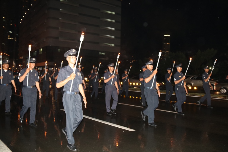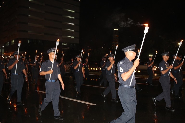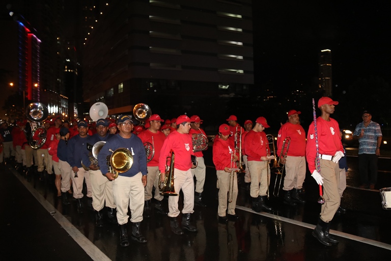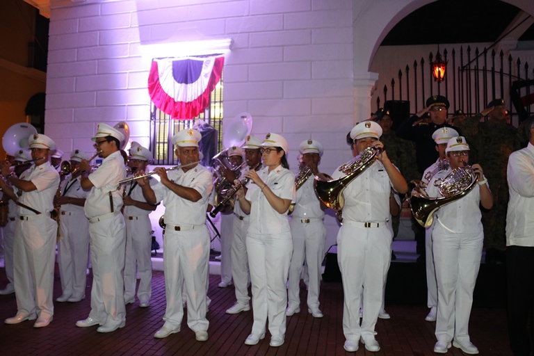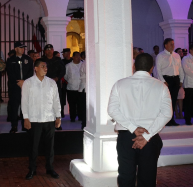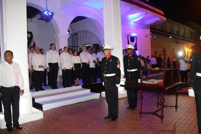 El Director General de la Policía Nacional de Panamá Alonso Vega Pino, acompañó en horas de la noche de este domingo 2 de Noviembre al Excelentísimo Señor Presidente de la República Juan Carlos Varela Rodríguez, en la ceremonia protocolar de nuestra primera enseña patria, que se realiza anualmente en la entrada dela Presidencia de la República. Con una delegación conformada por 50 unidades, la Policía Nacional de Panamá participó del desfile de antorchas de los estamentos de seguridad pública y el paseo de la primera bandera nacional de nuestro país, confeccionada por María Ossa de Amador en 1903, la cual reposa dentro de una urna en el Museo de Historia de Panamá. En este evento participaron además delegaciones del Cuerpo de Bomberos de Panamá, el Servicio Nacional de Fronteras, el Servicio Nacional Aeronaval y del Servicio de Protección Institucional, a cuya Guardia de Honor le correspondió escoltar la bandera hasta la presencia del Excelentísimo Señor Presidente de la República Juan Carlos Varela, quien dio la voz de mando para devolverla a su lugar de origen en el Museo de Historia de Panamá. El mandatario panameño estuvo acompañado por miembros de su gabinete y los jefes de los diferentes estamentos de seguridad nacional. |