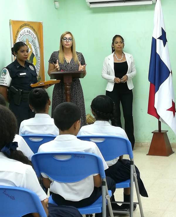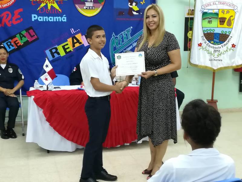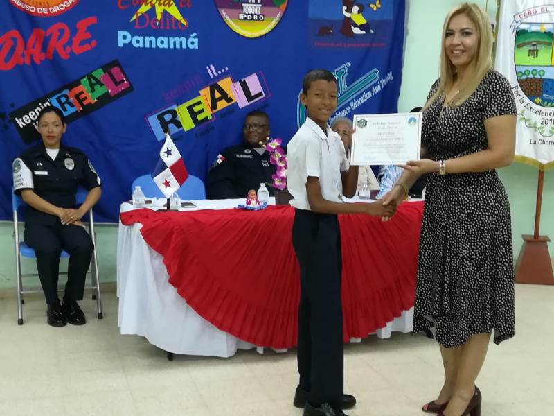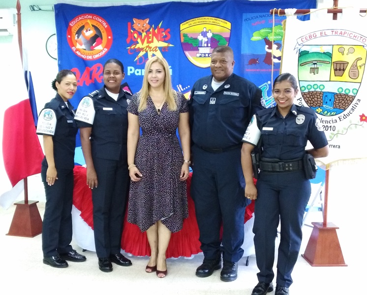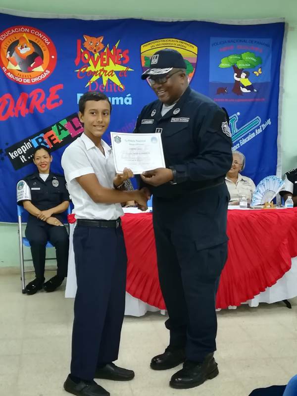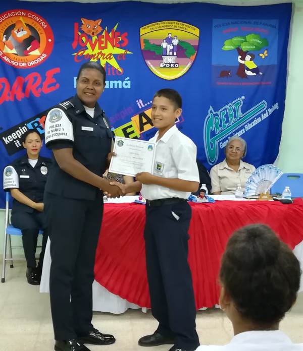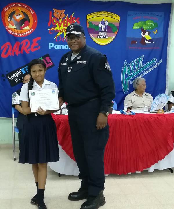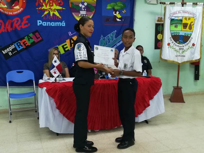 Unos 52 estudiantes del 6to. grado del Centro Educativo Básico General El Trapichito en La Chorrera, culminaron con éxito el programa preventivo de la Policía Nacional, Educación para Resistir el uso y abuso de las drogas y la Violencia (DARE), que impartieron las unidades de Niñez y Adolescencia de la 10ma. Zona. La cabo 1ro.Lourdes De Gracia instructora del curso destacó que el objetivo del programa es orientar a los estudiantes, para prevenir que sean víctimas del flagelo de las drogas y alejarlos de personas con malas costumbres que los pueden perjudicar. La entrega de certificados, reconocimientos y medallas estuvo a cargo del comisionado Luis Navarro jefe de la Zona, la Capitán Ilka Prado encargada del Servicio de Niñez y Adolescencia e La Chorrera, la directora del plantel la magister Melitza Mata, y la directora regional del SENNIAF Panamá Oeste Rosa Iturralde y la instructora cabo 1ro. Lourdes de Gracia. Por su parte la magister Melitza Mata, directora de la escuela, manifestó su agradecimiento a las unidades de la Policía Nacional, por integrar este tipo de programa en las escuelas y sobre todo pedir desde ahora, que para el próximo año su escuela pueda recibir este beneficio del cual está segura que será de gran utilidad no solamente para los estudiantes sino también para todas las la familias. |