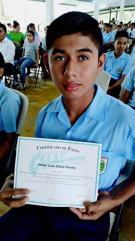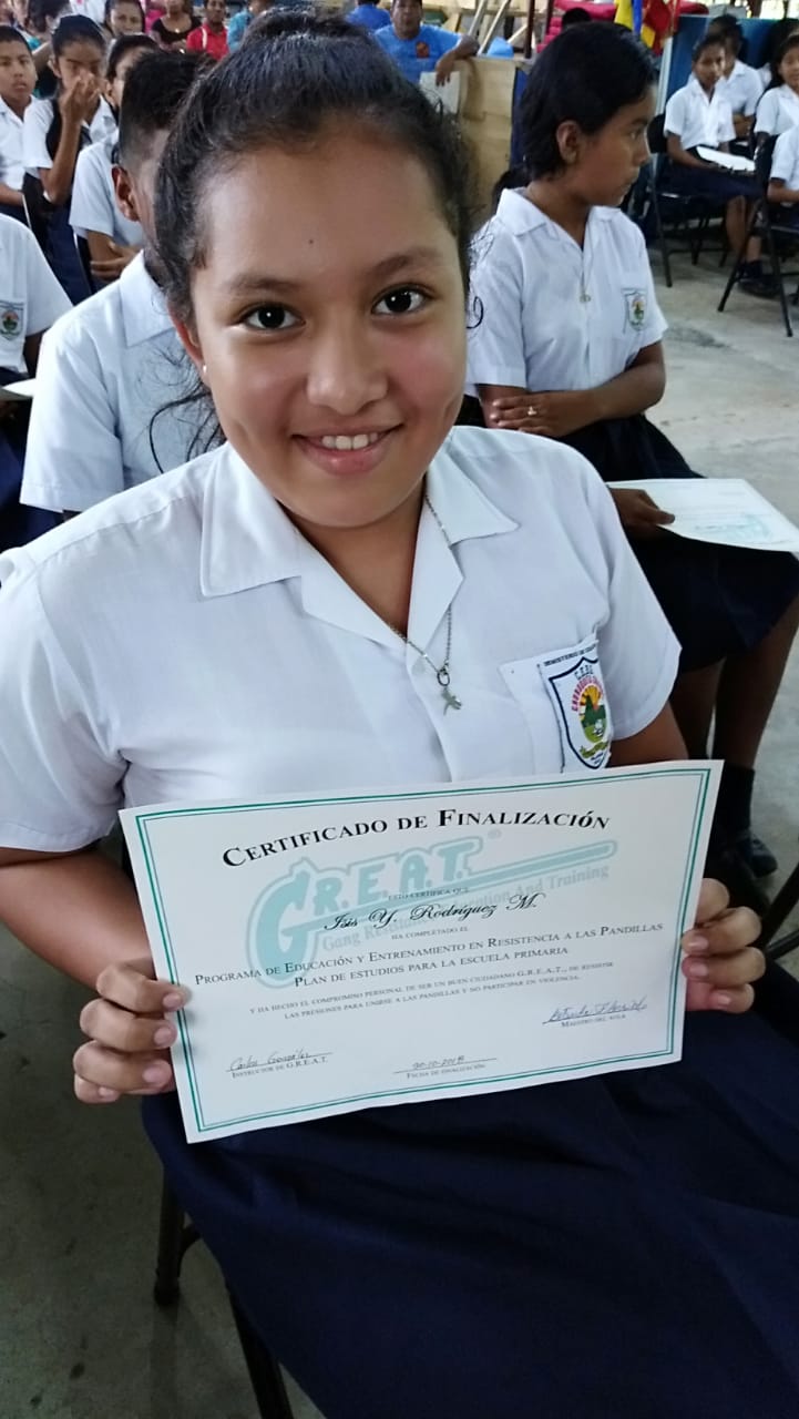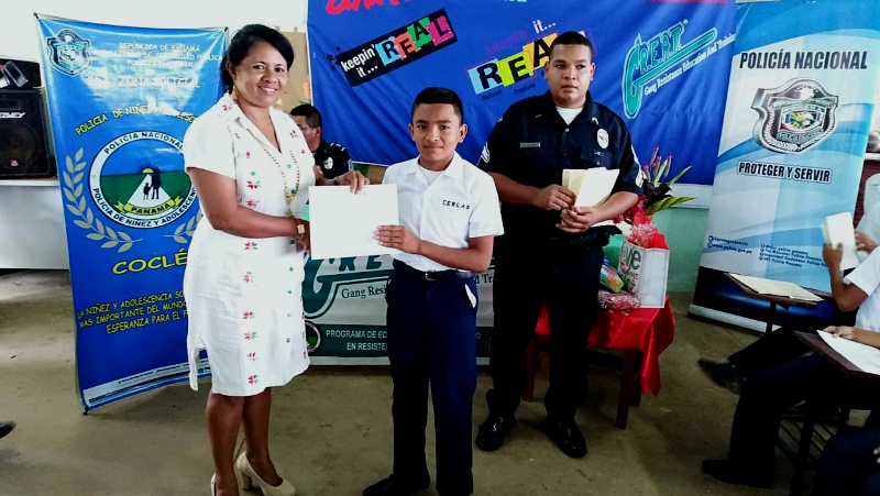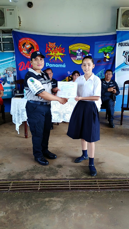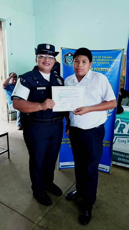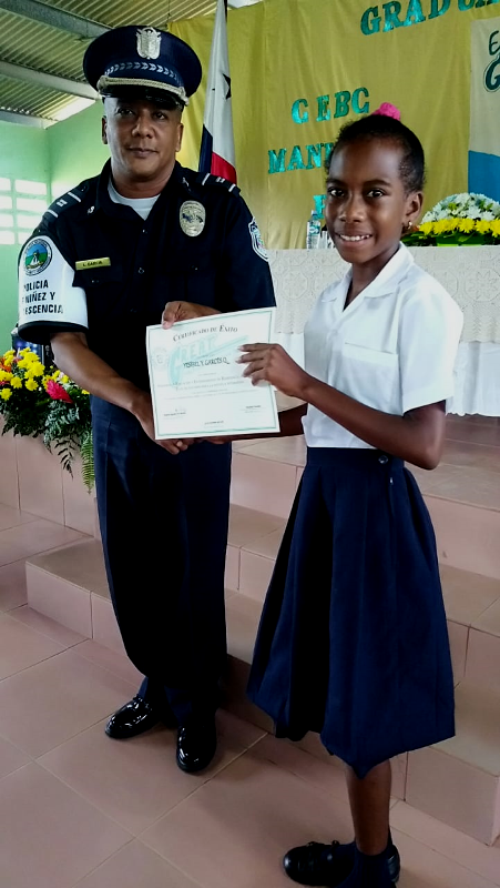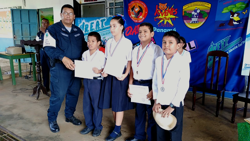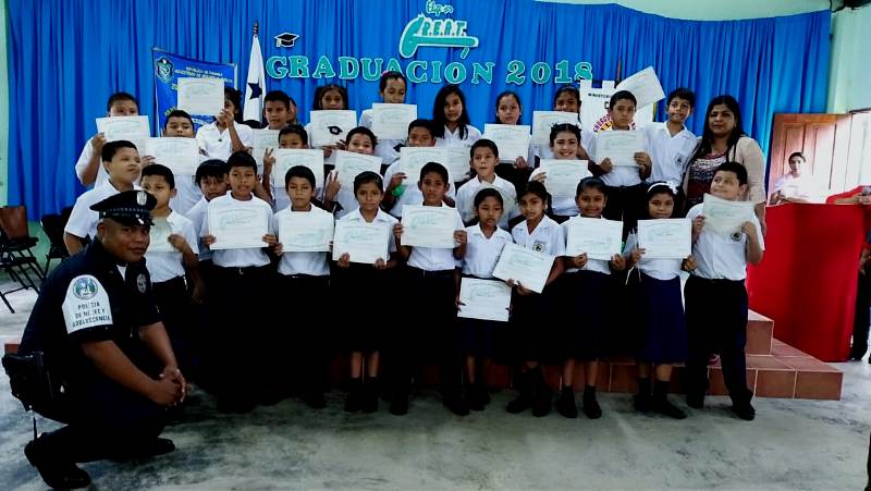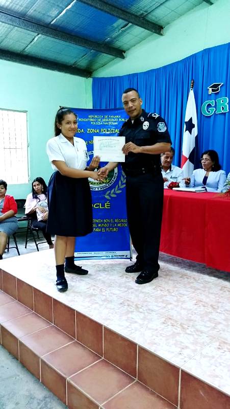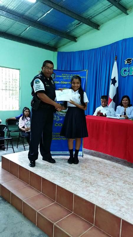 Con gran satisfacción más de 300 estudiantes de diferentes escuelas se graduaron del programa de la Policía Nacional Educación y Entrenamiento en Resistencia a las Pandillas (G.R.E.A.T.), impartido por unidades de la Policía de Niñez y Adolescencia en la provincia de Coclé. Cabe destacar que entre las escuelas beneficiadas con el programa de desarrollo humano de la Policía Nacional se encuentran los Centros Educativos Ángel Guardián en el distrito de la Pintada, Pablo Alzamora de Penonomé, Manuel Patiño en Antón, Churuquita Grande, Salitrosa y Ana Polo Tapia en Aguadulce. El teniente Ismael González encargado del servicio de Niñez y Adolescencia en Coclé, expresó que hasta la fecha unas 48 escuelas han sido beneficiadas con el programa G.R.E.A.T, donde satisfactoriamente 3,883 estudiantes han culminado el programa preventivo en este año y faltan aún por graduar 376 estudiantes en los diferentes planteles escolares de la provincia, así dio a conocer el uniformado. Es importante recalcar que en estos actos se llevaron a cabo bailes folklóricos, presentaciones e interpretaciones de mejorana y contaderas alusivas al desarrollo del programa G.R.E.A.T. de la Policía Nacional en las escuelas, además entregaron reconocimiento a los estudiantes de mejor desempeño en el curso al igual que a los instructores. Se conto con la presencia del comisionado Aníbal Prados, jefe de la Zona Policial Coclé, el capitán Jorge Sánchez encargado de área A Penonomé, teniente Ismael González encargado de Niñez y Adolescencia de la Zona de Coclé, directores de las escuelas los magister Virginia Villacrees, Olmedo Valdés, Betzy Pinzón, Migdalia de Aguilar, Leonidas Cisneros, Benilda Torres autoridades del ministerio de Educación, del Instituto para la Formación y Aprovechamiento de Recursos Humanos (IFARHU), personal administrativos de las escuelas, padres de familias entre otros invitados. Para los padres de familias y educadores de los planteles educativo dijeron sentirse complacidos con el logro y trabajo que realiza la Policía de Niñez y Adolescencia en la provincia de Coclé garantizando la seguridad y prevención en sus niños y adolescentes . |