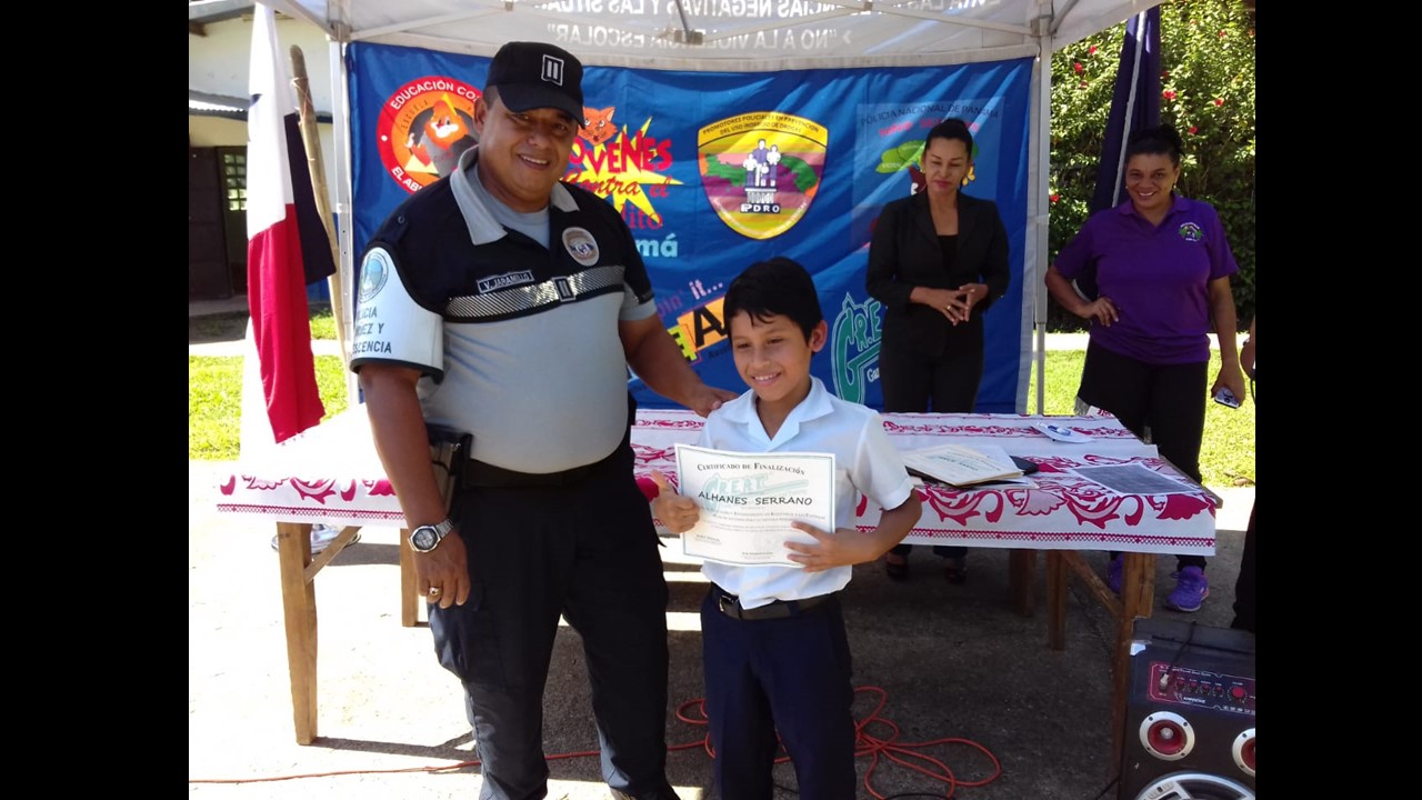 Unidades de la Policía de la Policía Nacional de servicio en Niñez y Adolescencia de la 1ra. Zona Policial de Bocas del Toro, capacitaron a estudiantes de la Escuela Primaria de San San Puente en el distrito de Changuinola. Para resaltar la actividad, se realizó una ceremonia de graduación donde participaron los jóvenes estudiantes, todos los profesores del plantel y padres de familia. A cada uno de los participantes se les hizo entrega de un certificado de reconocimiento por haber culminado satisfactoriamente el curso completo del programa GREAT (Educación y Entrenamiento en Resistencia a las Pandillas). Los estudiantes beneficiados cursan el 4to, 5to y 6to, grado, los estudiantes destacados recibieron presentes por parte de los Instructores luego, al finalizar la actividad todos disfrutaron de un brindis. |