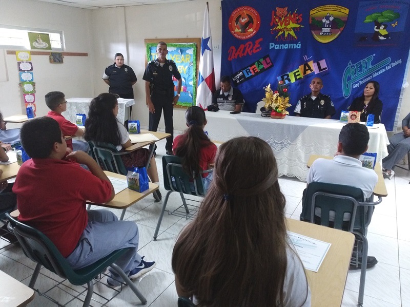En una sencilla pero significativa ceremonia, 19 estudiantes de 6to. grado de la Lion International School de la ciudad de David, recibieron sus certificados de culminación del curso GREAT (Educación y Entrenamiento en Resistencia a las Pandillas). Este es un programa que lleva adelante el servicio de Policía de Niñez y Adolescencia de la 4ta. Zona Policial de Chiriquí, con la finalidad de transmitir a los menores temas relacionados a la prevención y riesgos que conlleva pertenecer a pandillas. Al hacer uso de la palabra, la profesora Paola Fernández, en representación de la directora del plantel educativo, Profesora Nilka Morales de Santamaría, agradeció a la Policía Nacional por haberlos tomado en cuenta en este tipo de programas, cuyos resultados se verán finalmente reflejados en los estudiantes, en sus hogares, en las escuelas, y en el mismo sistema de educación. La ceremonia la clausuró el Mayor Antonio Domínguez, en nombre del jefe de la zona policial en Chiriquí, Comisionado Sisinio Núñez Rodríguez, quien instó a los graduandos a poner en práctica todos los conocimientos adquiridos para que sean hombres y mujeres de bien, productivos a nuestra sociedad. Con esta última graduación fueron beneficiados un total de 2,715 estudiantes de los diversos centros educativo de la provincia, durante el año de 2018.