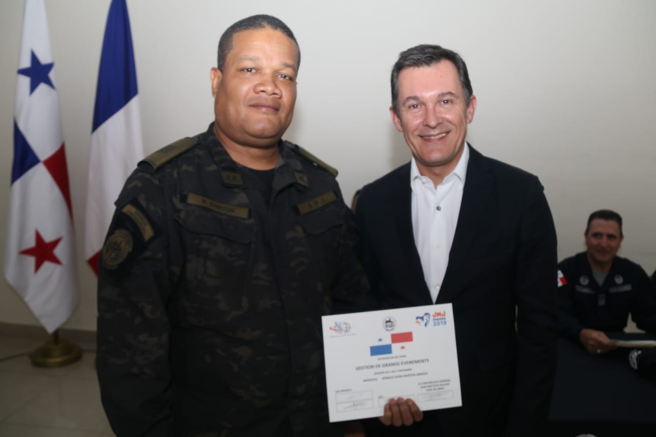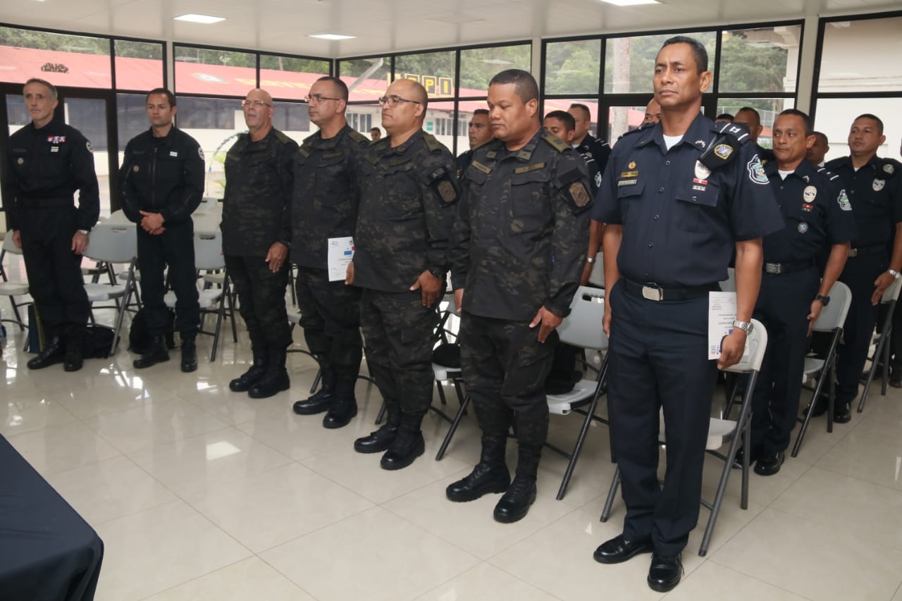 Un grupo de 19 unidades de la Policía Nacional y del Servicio de Protección Institucional culminaron con éxito el curso “Gestión de crisis durante los grandes eventos con riesgos de terrorismo” dictado por la Policía Nacional de Francia RAID del 3 al 7 de diciembre. Este curso tuvo como objetivo principal capacitar a las unidades en el área de inteligencia con prácticas enfocadas en técnicas de protección y armas con miras a lo que será la Jornada Mundial de la Juventud. “La Policía Nacional realiza este tipo de cursos con el fin de preparar a nuestras unidades para el gran el evento que se aproxima en enero 2019 y así también afrontar grandes responsabilidades como país en futuros eventos de gran magnitud” menciono el comisionado Manuel de León director General de Docencia. A este evento desarrollado en la base del S.P.I. en Corozal asistió el Secretario General de la Policía Nacional Ezequiel Carrizo, el Embajador de Francia en Panamá Brice Roquefeuil e invitados especiales. Este intercambio de conocimientos se hace posible gracias a la cooperación que mantienen ambas policías Panamá-Francia. |