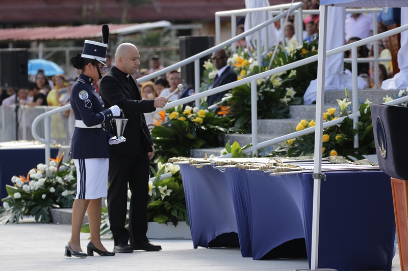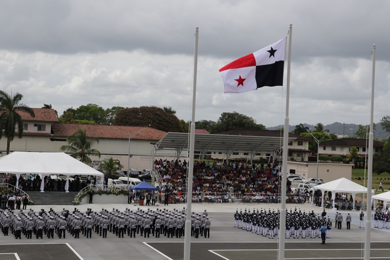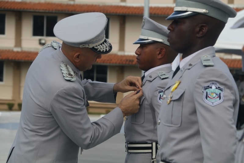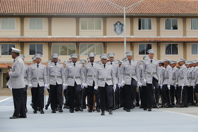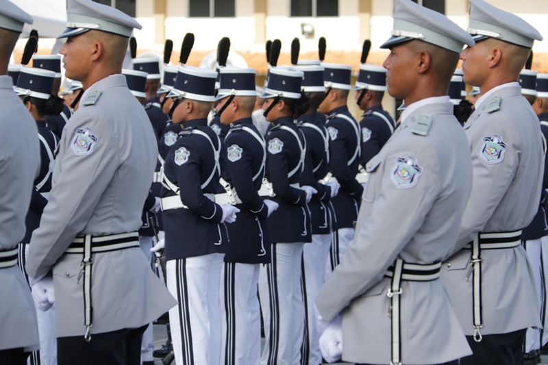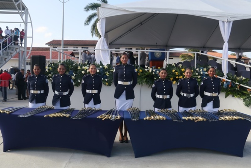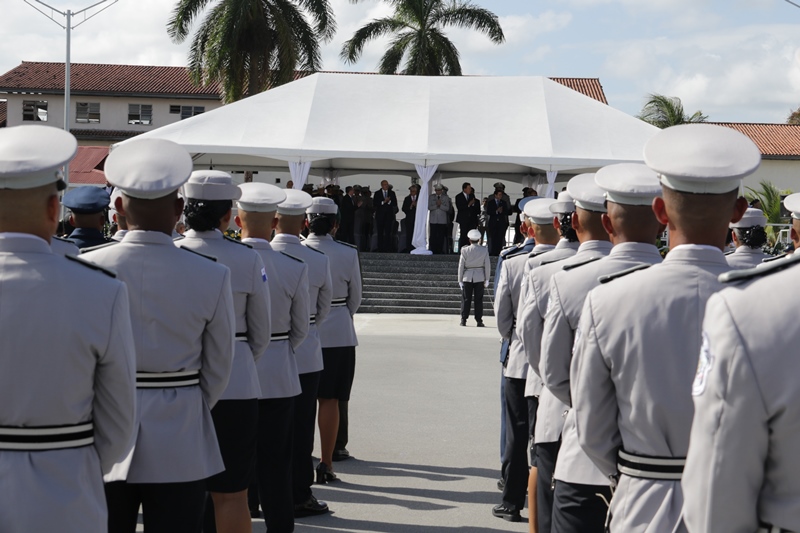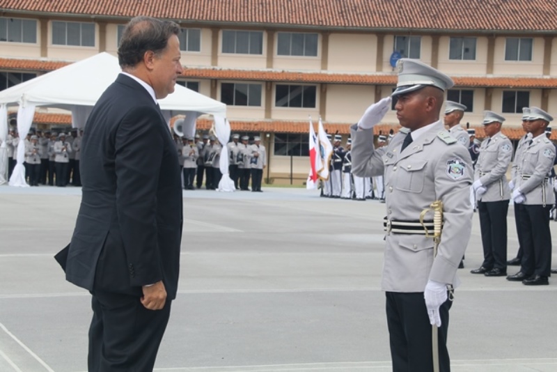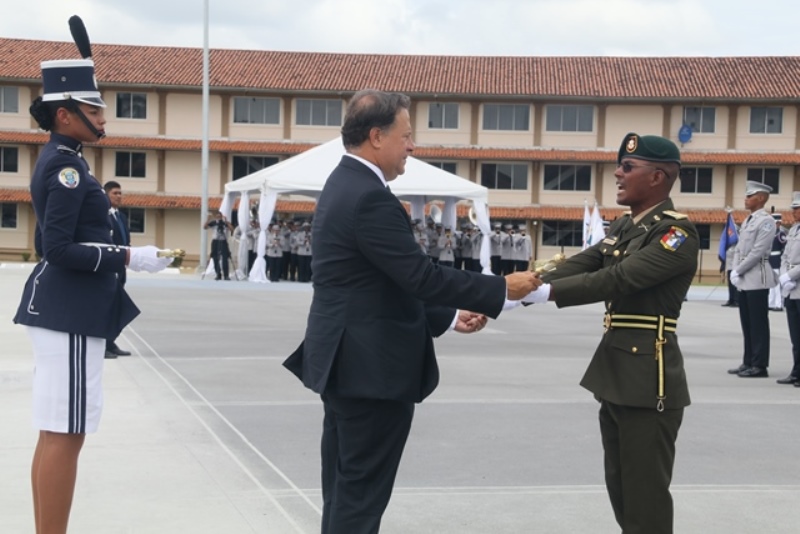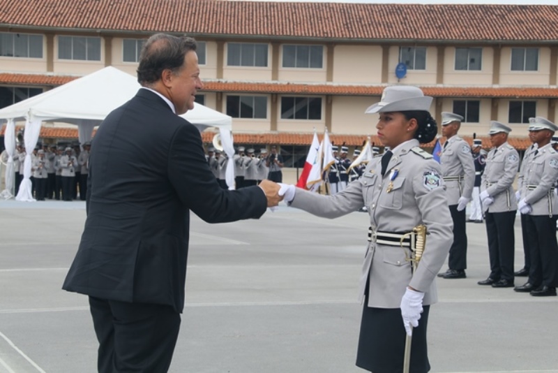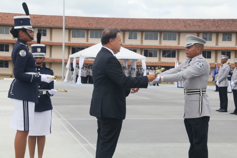 Panamá, 7 de enero de 2019. “Me siento orgulloso por la disciplina de los 143 nuevos oficiales con los que cuenta el país, la defensa a la Patria se realiza día a día, permanezcan leales a su institución y al Estado” dijo el Mandatario de la República Juan Carlos Varela durante acto de graduación de subtenientes de la Promoción XVIII que lleva por nombre “general Tomás Herrera” de la Escuela de Oficiales de Policía Dr. Justo Arosemena. Los nuevos subtenientes recibieron de manos del Presidente de la República el sable que simboliza el mando, honor, valentía y convección y compromiso con la Patria. “La defensa de la Patria se realiza cada día, cuando entregamos lo mejor de nosotros en nuestro trabajo, cuando salvamos una vida. Estimados graduados: permanezcan leales a su institución y al Estado, la Patria se los agradecerá” destacó el Presidente Varela. En tanto, el Ministro de Seguridad Pública, Jonattan Del Rosario agradeció a las unidades de la Fuerza Pública la labor que llevan a cabo día a día e instó a los nuevos oficiales a continuar con la vocación de servicio, teniendo siempre presente los valores inculcados en este centro de enseñanza. Los tres primeros puestos de la promoción XVIII, los subtenientes Raúl Caicedo, Ricardo Fabris y a Nicole González recibieron por parte Director General Alonso Vega Pino la imposición de la Medalla de Condecoración Dr. Justo Arosemena. “Esta promoción es el producto de una suma de saberes que integran su perfil profesional, donde lo técnico se añade a lo tecnológico y científico”recalcó el director policial. La décimo octava promoción está conformada por 4 unidades del Servicio de Protección Institucional, 2 del Servicio Nacional Aeronaval, 1 del Servicio Nacional de Fronteras y 5 peruanos. Se unieron a los subtenientes panameños, 16 oficiales graduados en el extranjero; 2 de Uruguay, 4 de Chile, 4 de Argentina, 1 de Colombia, 2 de Paraguay y 3 de Perú. El acto contó con la presencia de ministros de Estado, autoridades de la provincia de Colón, Agregados Militares y Navales, miembros del Directorio Policial, directores de los demás estamentos de seguridad e invitados especiales.
