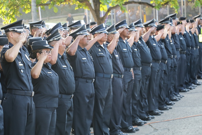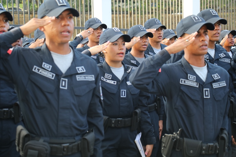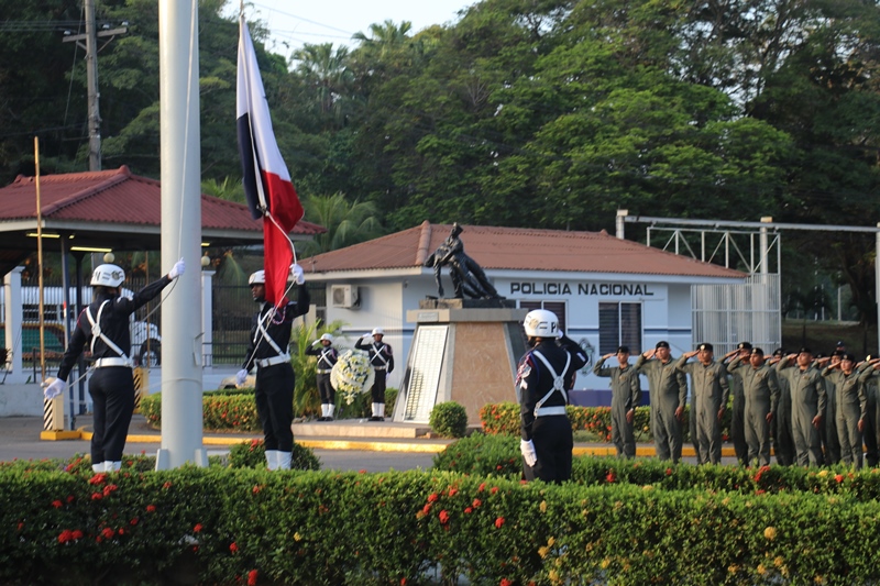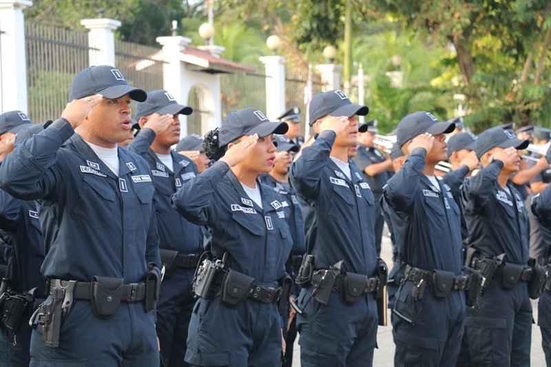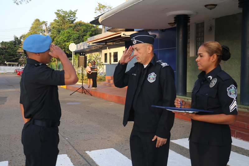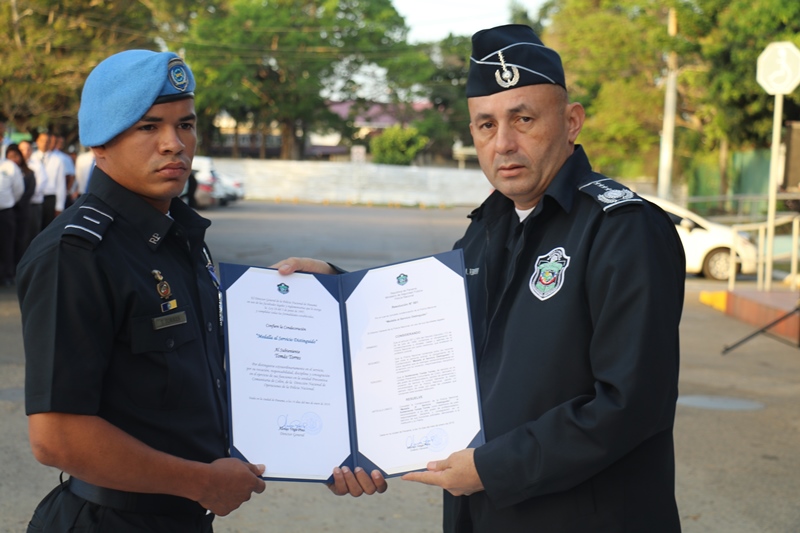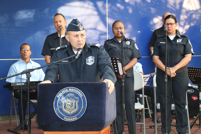“Nosotros siempre estamos llenos de retos y compromisos, esa es la vida institucional; al Subteniente Tomás Torres, por su valentía y compromiso; a los organizadores del evento folclórico de las Mil Polleras, mis respetos por todo el trabajo, la logística, esfuerzo y la dedicación, como Director General me siento orgulloso de ustedes”, expresó el Director General de la Policía Nacional, Alonso Vega Pino durante el primer acto cívico del 2019. En medio de este acto, el Director General condecoró con la Medalla al Servicio Distinguido, al Subteniente de la Policía Nacional, Tomás Torres, de servicio en la Unidad Preventiva Comunitaria (UPC), Colón-Altos de Los Lagos, quien se enfrentó a delincuentes y se logró recuperar dos armas de fuego. “Corremos peligro cada vez que salimos a la calle, mi vida corrió peligro, pero siempre Dios nos cuida y nos protege y así pude dar con la captura del homicida y posterior recuperación de dos armas de fuego”, dijo el oficial Torres. El Subteniente Tomás Torres, narró que se encontraba patrullando por la zona cuando le correspondió capturar a un ciudadano que había cometido un homicidio, en Colón-Altos de Los Lagos. “Sentí un poco de temor porque sabía a qué me enfrentaba, pero todo fue rápido y el miedo quedó de lado”, puntualizó. El jefe policial también resaltó la importante labor que llevan a cabo las unidades en lo que será la Jornada Mundial de la Juventud y en el recibimiento que le dan a los miles de peregrinos que ya empiezan a llegar a Panamá. El Subdirector de la Policía Nacional, Jacinto Gómez, miembros del Directorio Policial, acompañaron al Director General de La Policía Nacional, Alonso Vega Pino, a la colocación de la ofrenda floral al monumento en honor a los policías caídos en cumplimiento del deber, quienes entregaron su vida por la seguridad del país. Con las gloriosas notas de nuestro Himno Nacional se dio por culminado el acto cívico.