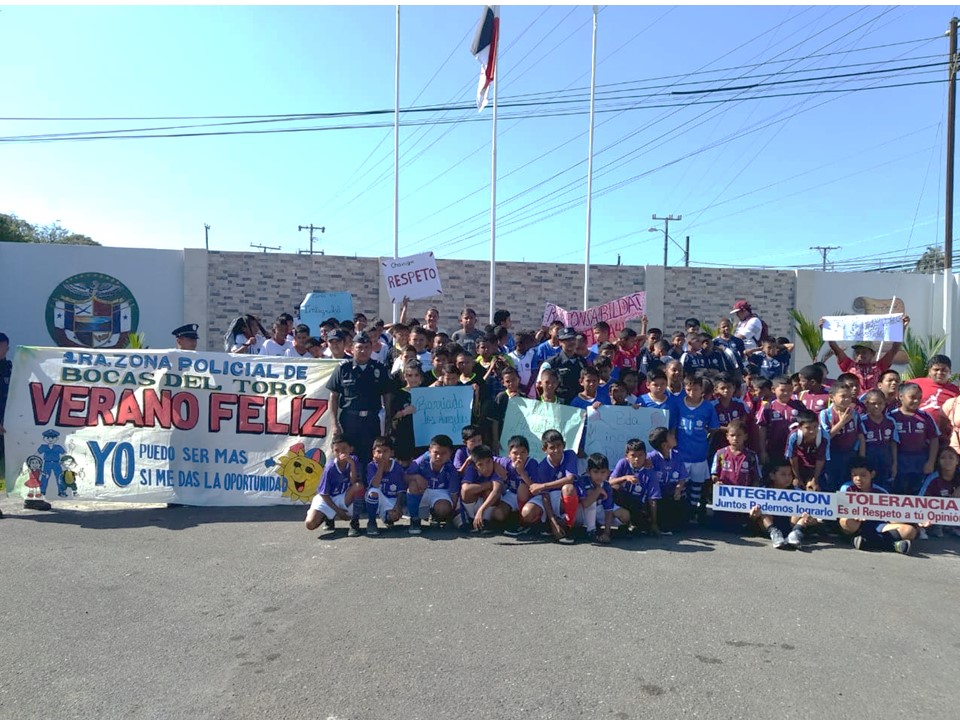 Unidades de la Oficina de Seguridad Ciudadana de la 1ra. Zona Policial de Bocas del Toro inauguró el programa Verano Feliz 2019 en el distrito de Changuinola, iniciando con una caminata por la avenida 17 de abril en el área comercial, luego más de 120 niños y niñas fueron trasladados en buces de la Policía Nacional hasta la cancha sintética de la comunidad de Finca 04. Este año el Verano Feliz ha traído un interesante torneo de fútbol donde participaron equipos mixtos de niñas y niños de 10 a 12 años de edad, quienes disputaron el primer lugar de la Copa Verano Feliz 2019. Una vez en la cancha de juegos, se realizó un pequeño acto inaugural con la participación del Comisionado Julio Cesar Jean Louis, Jefe de la 1ra Zona Policial de Bocas del Toro, el cual instó a todos los jóvenes a practicar actividades positivas y a seguir estudiando con mucho esmero. Este evento se realizará todos los días a partir de hoy, hasta el próximo sábado 2 de febrero de 2019, día en que se jugará la gran final, en el lugar se hicieron presentes una notable cantidad de público amigos y familiares de los jugadores.