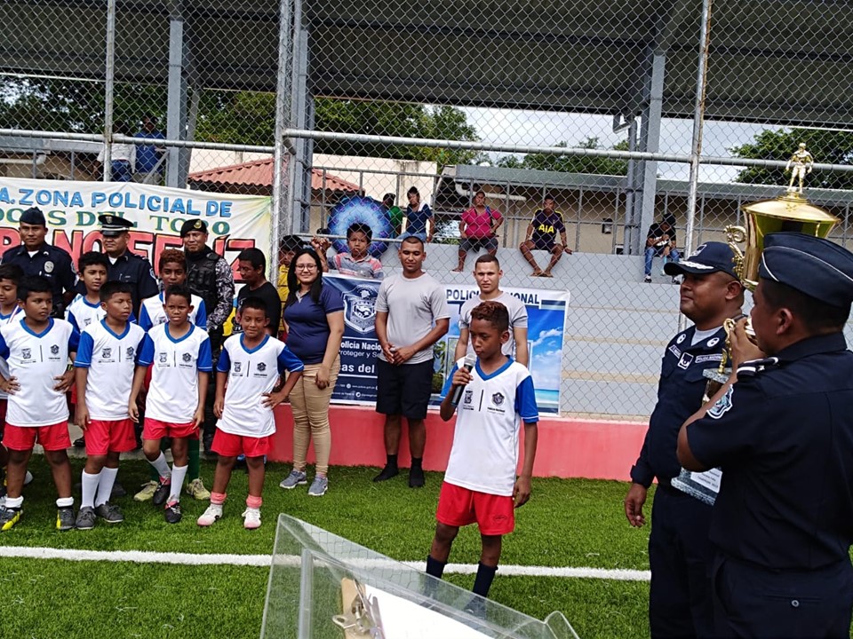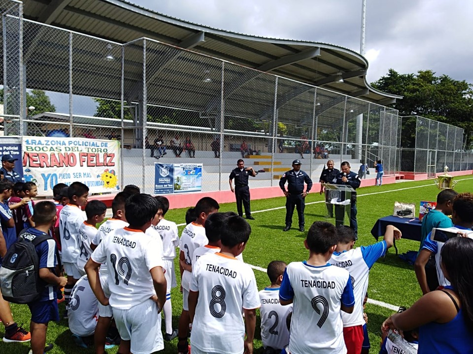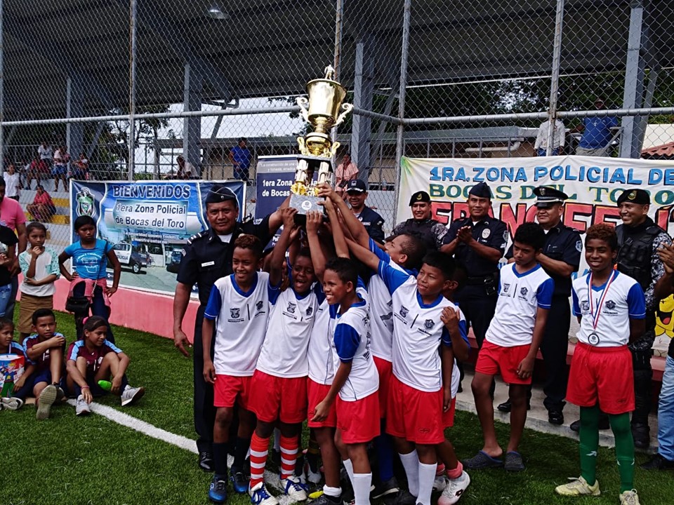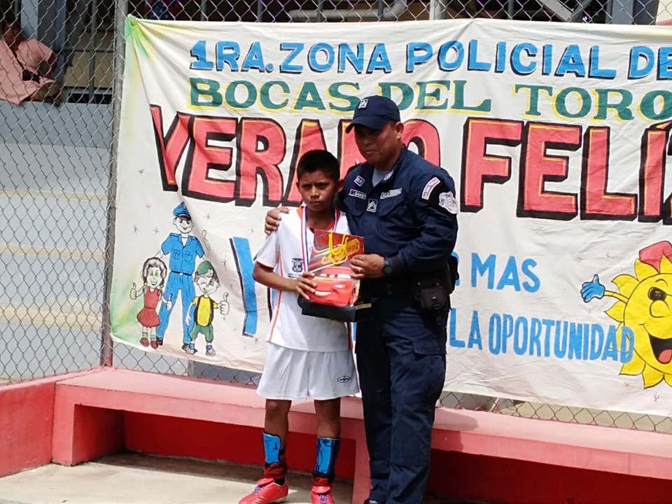 Unidades de la Policía Nacional de servicio en la Oficina de Seguridad Ciudadana de la 1ra. Zona Policial de Bocas del Toro, realizó la gran final de un torneo de Futbol Mixto donde ocho equipos conformados de niñas y niños se enfrentaron por espacio de una semana. En estos encuentros resultó como ganador del tercer lugar el equipo de la comunidad de Lincon Creek, del segundo lugar fue la comunidad de Finca 44 y el primer lugar lo ocupó el equipo de Finca 41. Igualmente fueron premiados los jugadores destacados del torneo como lo fueron el mejor portero, el mejor goleador y el jugador con mejor espíritu de cuerpo. Se entregaron certificados de agradecimientos a todos los directores de los diferentes equipos y a los árbitros, las palabras de agradecimiento fueron dadas por el Mayor Oriel Gil en representación del Comisionado Julio Cesar Jean Louis, Jefe de la 1ra. Zona Policial de Bocas del Toro. La actividad estuvo concurrida por una considerable cantidad de espectadores quienes gritaban consignas a favor de su equipo, los equipos que ocuparon los primeros lugares fueron llevados al Restaurante Macdonal donde disfrutaron el triunfo. |