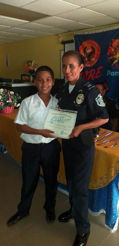 Unidades de la 2da. Zona de Policial de Coclé, a través del Servicio de Niñez y Adolescencia, llevaron a cabo una graduación del programa de Educación y Entrenamiento en resistencia a las Pandillas (GREAT), en el distrito de Natá. La actividad se desarrolló en el Centro Básico General El Cortezo y contó con la presencia del director del plantel, profesor Carlos Ortiz, los encargados del Departamento de Niñez y Adolescencia el Capitán Ismael González, la Teniente Linded Pineda y los instructores del programa "GREAT" el Sargento Amable Herrera, la Sargento Mailyn Jaramillo. Los estudiantes de dicho plantel obtuvieron un certificado por haber terminado el curso y obsequios alusivos a la ocasión. La Policía Nacional Continuara con los programas de desarrollo humano, como parte de las acciones de Seguridad Ciudadana. |