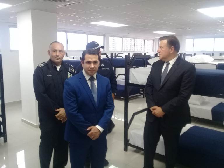 El presidente de la república Juan Carlos Varela, inauguró este jueves 27 de junio las instalaciones que albergarán la 15ava. Zona Policial Este, acto este que contó con la presencia de altos funcionarios del Consejo y el Ministerio de Seguridad, además de miembros del Directorio de la Policía Nacional y de su Director General Alonso Vega Pino. El nuevo cuartel policial con sede en Don Bosco brindará sus servicios en diversas comunidades incluyendo Juan Díaz, Los Robles, Don Bosco, Mañanitas y Tocumen, entre otros sectores. Cuenta además con modernos baños , lavamanos , servicios higiénicos, así como cuadras o dormitorios para damas y caballeros. Se integran además una moderna sala de video vigilancia, una armería y un moderno taller de mecánica con 6 bahías para la reparación de autos patrullas. Con la construcción de esta nueva estructura, se logra dotar a la policía nacional de instalaciones modernas, seguras y funcionales para mejorar el desempeño policivo y el servicio de seguridad a la población. |
