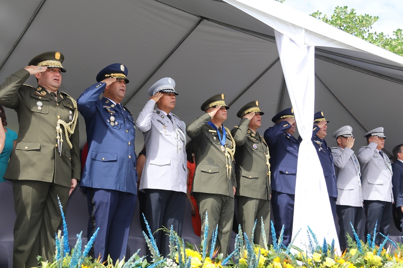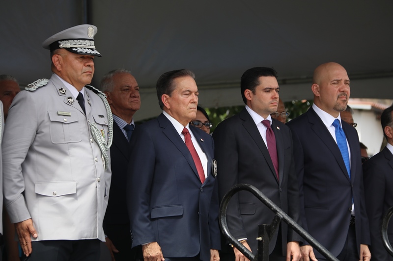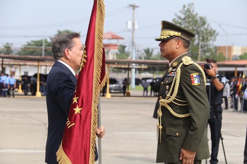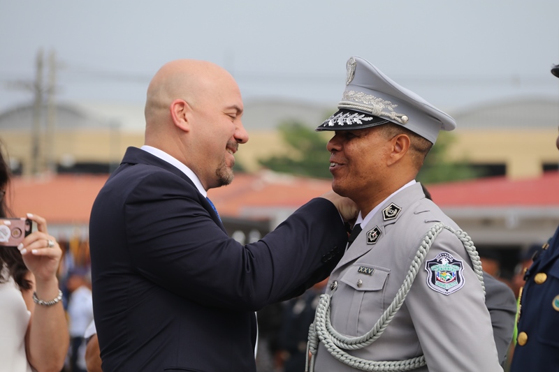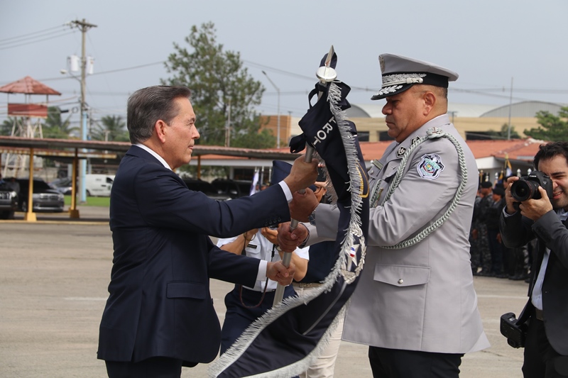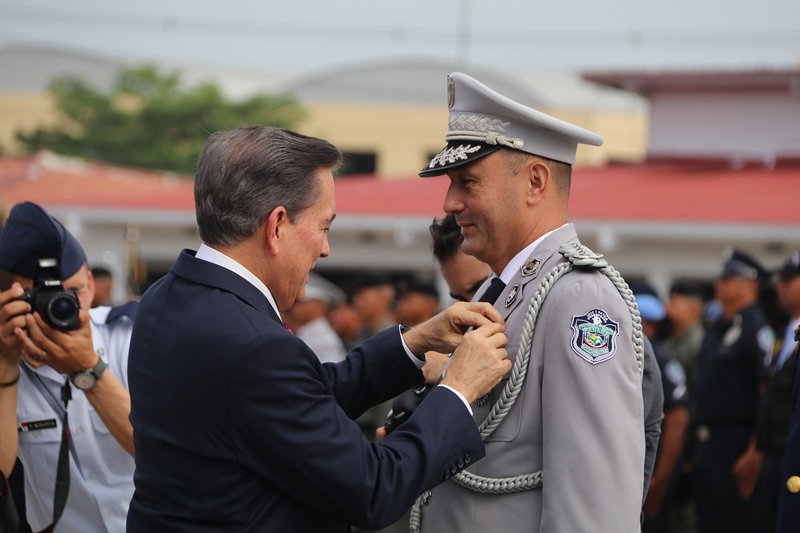 El presidente de la República, Laurentino Cortizo Cohen, durante la ceremonia de cambio de mando de los estamentos de seguridad del Estado, expresó que ya se había comprometido a ser el primer obrero del país, y que adicionalmente hoy “soy el primer policía de Panamá, y me siento honrado de esa distinción”. Cortizo Cohen transfirió este jueves el mando del director de la Policía Nacional, Jorge Miranda Molina; al director del Servicio Nacional de Fronteras (SENAFRONT), Oriel Ortega, y al director del Servicio Nacional Aeronaval, Juan Manuel Pino, en una ceremonia en la cual participaron el vicepresidente y ministro de la Presidencia, José Gabriel Carrizo Jaén; y el ministro de Seguridad Pública, Rolando Mirones. El mandatario dijo que se trata de una ceremonia especial, única e histórica, porque por primera vez los tres estamentos de seguridad realizan de manera simultánea el cambio de mando “y eso es una señal clara y alta de que vamos a trabajar en equipo”. Cortizo Cohen dijo que la Policía Nacional debe garantizar la paz y seguridad ciudadana; con trabajo integral, en equipo, donde se destaque la prevención y coordinación con los ministerios de Educación, Desarrollo Social, Salud, la cultura y deporte, además de organizaciones comunitarias y gobiernos locales. El Mandatario instruyó a los directores entrantes a trabajar coordinadamente y con disciplina, porque la disciplina forja carácter, y vence las adversidades que enfrentan todos los días, y ayuda a construir el espíritu de cuerpo que necesitan y el espíritu de cuerpo logra metas, “y estoy seguro de que nuestros estamentos de seguridad, metas y objetivos serán cumplidos”. “El crimen los vamos a anticipar con información e inteligencia y tecnología. Esta administración, y escúchenlo bien, respetará el escalafón y la antigüedad, y vamos a asegurar que ese respeto perdure en el tiempo. Vamos a respetar el derecho a su descanso”, precisó. Destacó a las mujeres y hombres de la Fuerza Pública y a directores entrantes que nada sustituye el ejemplo; y a los oficiales, que respeten a sus subalternos, y a subalternos que respeten a sus superiores, siempre cumpliendo con la Constitución y las leyes de la República. “Mujeres y hombres de la Fuerza Pública, ahora a salir de las oficinas, a trabajar en el campo al lado de la gente. Para cada uno de ustedes, mi gratitud. Nosotros, el país, estamos en buenas manos con hombres y mujeres como ustedes”, puntualizó el mandatario. Durante la ceremonia, el presidente Cortizo Cohen entregó la “Medalla Mérito, José Luis Sosa”, al director saliente de la Policía Nacional, Alonso Vega Pino, por su destacada labor al frente de esta institución policial. Entregó la “Medalla Victoriano Lorenzo en grado de Gran Cruz” al exdirector del Servicio Nacional Aeronaval (Senan), Gilberto Méndez Jaramillo y la “Medalla Distinguida” al director saliente del Servicio Nacional de Fronteras (Senafront), Eric Estrada. El director saliente de la Policía Nacional, Alonso Vega Pino, le entregó el banderín de mando al presidente Cortizo Cohen, quien a su vez se lo pasó al nuevo director de esta institución, Jorge Miranda Molina. Lo mismo hizo el director saliente del Senan, Gilberto Méndez Jaramillo, con el director entrante de esta entidad, Juan M. Pino F. y el director saliente del Senafront, Eric Estrada, con el nuevo director de esta institución, Oriel Ortega Benítez. Por su parte, el ministro Mirones impuso los nuevos rangos al nuevo subdirector de la Policía Nacional, Alexis Muñoz; del Senan, Ramón Nonato López, y al nuevo subdirector del Senafront, Roger Mojica.