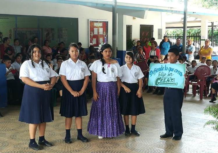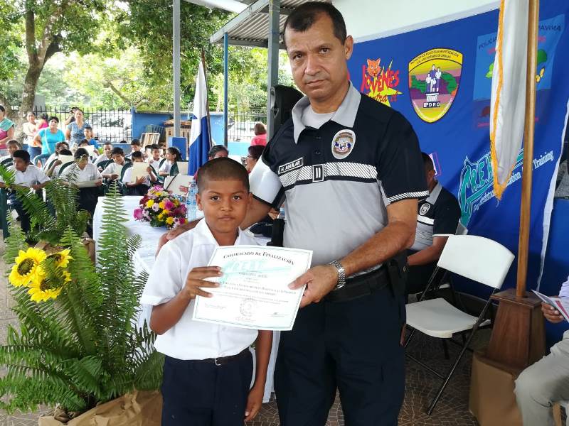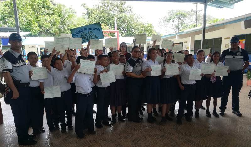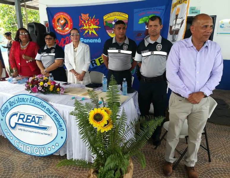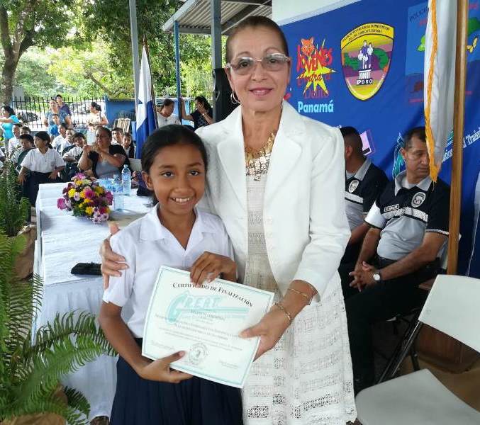 El capitán Juan Palacios, en representación del jefe de la Zona Policial de Chiriquí, subcomisionado Luis Miranda, presidió la ceremonia de graduación del curso GREAT, (Educación y Entrenamiento en Resistencia a las Pandillas) en la Escuela Llano Grande Abajo de Las Lomas, en el distrito de David. 153 niños y niñas de 4to. a 6to. grado recibieron instrucción, por parte de la Teniente María González, con temas sobre cómo evitar personas vinculados en pandillas, drogas, alcohol y evitar el Bullyng, entre otras cosas. La supervisora de educación de la zona No 3, profesora Irma Ríos, y la directora del plantel, Seith de Beitia, expresaron su agradecimiento a la Policía Nacional por incluir a ese centro educativo, en sus planes de acercamiento y de seguridad preventiva, dirigidos principalmente a la juventud. “Quiero felicitarlos y espero hayan absorbido todas las enseñanzas de la instructora del curso. Sean entes multiplicadores en sus hogares y en sus comunidades”, dijo el capitán Palacios al clausurar el evento. |