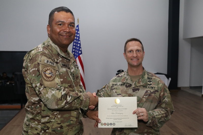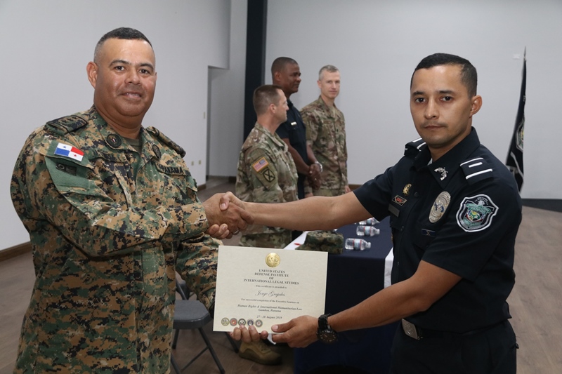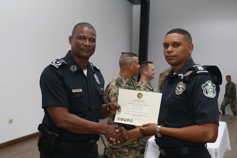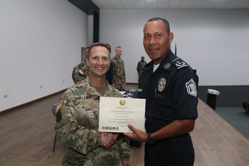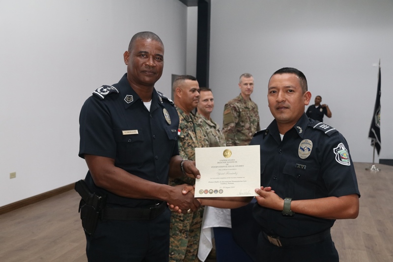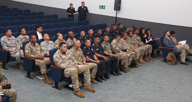 El auditorio del Instituto Superior Policial sirvió de escenario para la clausura del seminario sobre Derechos Humanos dictado por funcionarios de la Embajada de Los Estados Unidos en Panamá a miembros e integrantes de la Fuerza Pública y del Ministerio de Seguridad Pública de Panamá. El inspector general, comisionado Oswaldo Morales sostuvo que este seminario beneficia grandemente a todas las unidades que asistieron al mismo, quienes todos los días en su misión de proteger y servir entran en contacto directo con las comunidades. Añadió que dentro de los derechos humanos, entra en vigencia el buen trato al cual tienen derecho las personas en medio de la aplicación de la ley la seguridad. El teniente coronel de la Fuerza Aérea de Los Estados Unidos Steve Loertscher sostuvo que compartió con diversos países, las experiencias que en materia de Derechos Humanos han obtenido en diversas situaciones. “Siempre cuando estamos hablando de Derechos Humanos, todo ser humano debe recibir un trato con respeto y dignidad y es por eso que tenemos este tipo de evento, para recordarnos a todos, la importancia de este tema”, expresó el Teniente Coronel. En esta clausura participaron un total de 29 unidades del Servicio Nacional Aeronaval, otras 8 del Servicio Nacional de Fronteras y 14 de la Policía Nacional de Panamá además de cuatro funcionarios del Ministerio de Seguridad Pública. Correspondió al comisionado Luis Domínguez del Servicio Nacional Aeronaval agradecer a nombre de los participantes las enseñanzas recibidas. |