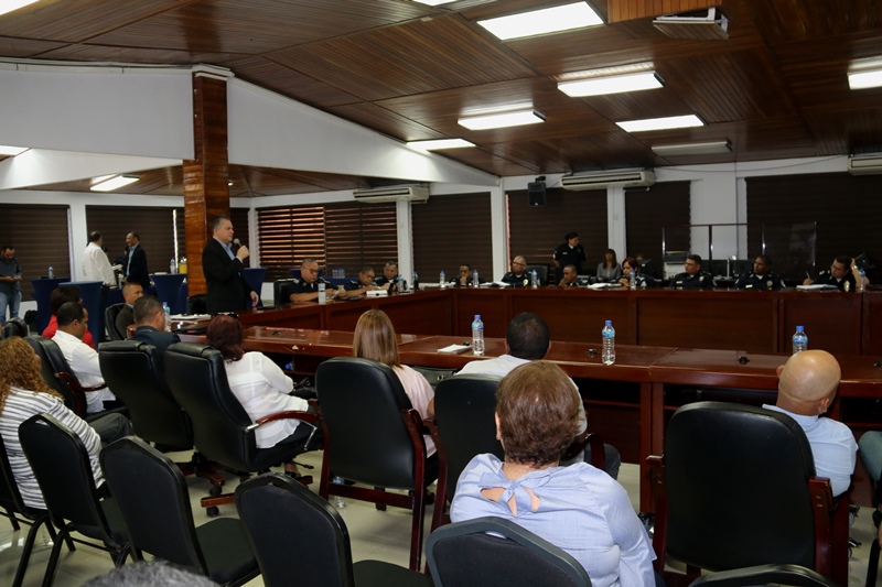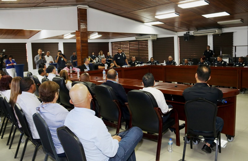 El director general de la Policía Nacional, Jorge Miranda Molina junto a miembros de directorio y jefes de zonas policiales, sostuvo una reunión con representantes de los corregimientos del distrito de Panamá, con miras a coordinar acciones conjuntas. En el encuentro que se realizó en el salón de reuniones de la sede de la Policía Nacional, en Ancón, los oficiales atendieron las inquietudes y recomendaciones de los ediles. “Somos de la comunidad y para comunidad” dijo el jefe policial, quien destacó la importancia de ser puentes y unir esfuerzos de manera armónica, a favor de los residentes de la urbe capitalina. Por su parte, el presidente del Consejo Municipal de Panamá, H.C. Carlos Pérez Herrera, agradeció al director general, Jorge Miranda Molina, por la labor realizada, reiterando el respaldo a las estrategias de seguridad. |