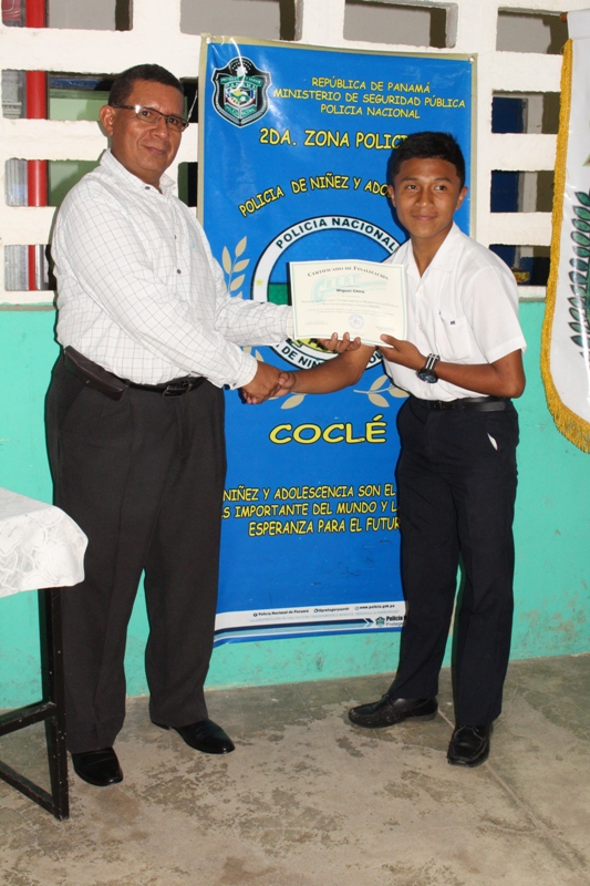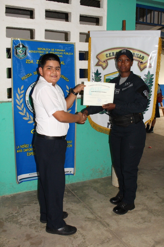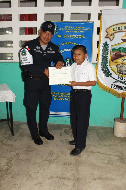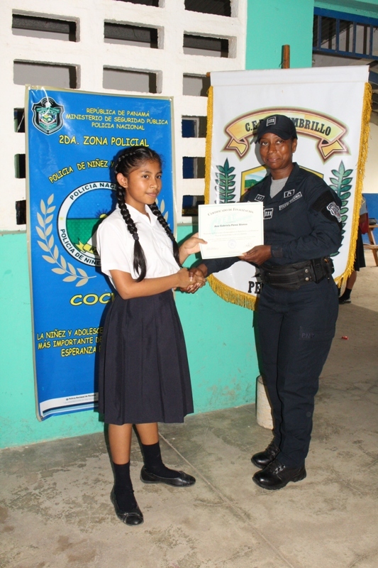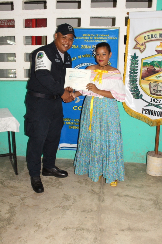 Estudiantes del centro educativo Membrillo, ubicado en el distrito de Penonomé, provincia de Coclé, recibieron sus certificados al culminar la capacitación del programa de Educación y Entrenamiento en Resistencia a las Pandillas (GREAT). Los alumnos aprendieron a decirles no a las pandillas, en las lecciones impartidas por las unidades del Servicio de Policía de Niñez y Adolescencia, quienes abordaron la presión de grupo, las consecuencias del bullying y acoso escolar, entre otros temas. La capitán Felipa Murillo dijo que con el programa preventivo se busca garantizar el bienestar de niños y adolescentes, reforzando los valores como parte de la formación integral. Por su parte, la estudiante Emily Soto del VI grado, en representación de sus compañeros agradeció al cabo Carlos González y demás miembros de la Policía Nacional por la información brindada. El director del plantel, Iván López destacó la importancia de los conocimientos que serán de gran utilidad para el personal docente. |