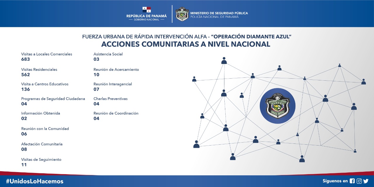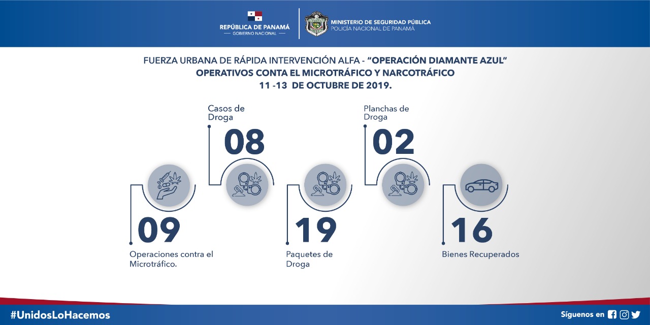 La Fuerza Urbana de Rápida Intervención (Alfa) de la Policía Nacional, mediante la “Operación Diamante Azul”, capturó 347 personas vinculadas a diferentes delitos y causas, decomisó 38 paquetes con sustancias ilícitas e incautó 14 armas de fuego. De las personas capturadas, 269 fue por oficios, 16 por faltas administrativas, 47 por flagrancia y 15 por microtráfico y narcotráfico. El director de la Policía Nacional, Jorge Miranda, indicó que en el país, el grupo Alfa realizó 60 toques de queda y 59 allanamientos. Producto de estas acciones, se recuperaron 25 bienes (vehículos) que mantenían denuncias por robo y hurto. En conjunto con el Ministerio Público, en las últimas 72 horas, agregó, se capturó a dos presuntos implicados en el homicidio de una menor en el sector de Altos de Los Lagos en Colón y otro ciudadano que se dedicaba al hurto de vehículos con arma blanca. La estrategia de seguridad reflejó un total de mil 140 acciones comunitarias a nivel nacional, como parte del plan de acciones “Uniendo Fuerzas”, a través de visitas comunitarias en locales comerciales y residenciales. |