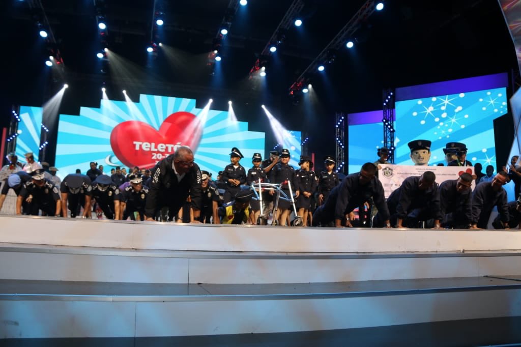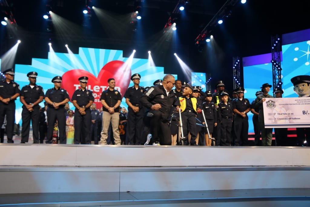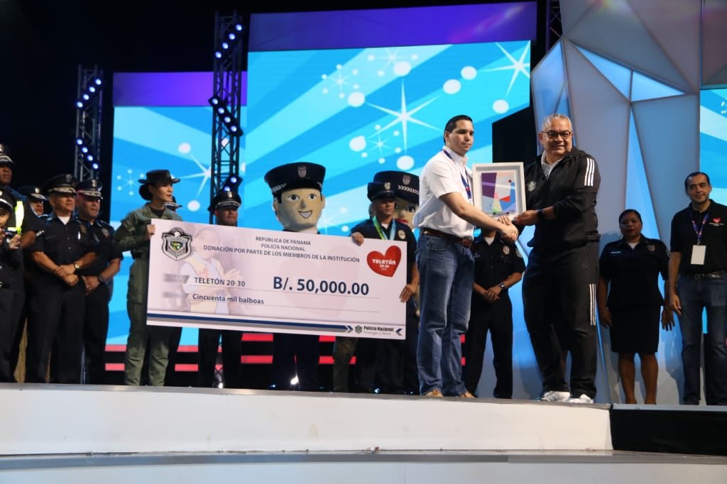 Comprometida con la niñez panameña, la Policía Nacional se hizo presente en la Teletón 20-30 2019, con una delegación encabezada por el director general, Jorge Miranda, quien entregó el cheque con la donación de 50 mil dólares. "Nos sentimos orgullosos y complacidos de respaldar esta hermosa hermosa causa que lleva esperanza a los niños de nuestro país" dijo el director general, Jorge Miranda. Con un tradicional trote de calentamiento hizo su entrada al escenario el jefe policial acompañado por estudiantes del Instituto Superior Policial, animando a todos apoyar esta actividad. Posteriormente, miembros de la institución unieron sus talentos en el canto y actuación en un sociodrama con mensajes preventivos y alusivos a la Teletón 20-30. La delegación de la Policía Nacional estuvo conformada por miembros del directorio, unidades de los servicios policiales, y atletas de la institución. En agradecimiento a la Policía Nacional por este aporte a la Teletón, el Club Activo 20-30 hizo entrega al director general de un reconocimiento. Desde hace 17 años la Policía Nacional se convirtió en la primera institución de seguridad en patrocinar este evento, reafirmando así, su promesa de servir al país.
