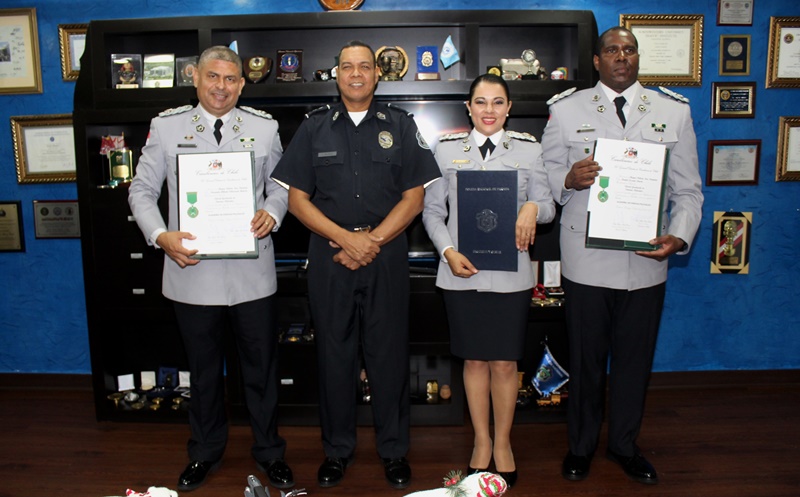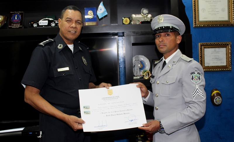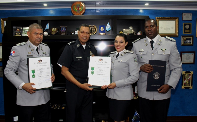 Un grupo de nueve uniformados de la Policía Nacional terminaron satisfactoriamente los cursos de Investigación Criminal, Enfermero y Herrador Equino, Perfeccionamiento para Oficiales, Oficial Graduado en Ciencias Policiales del Escalafón de Orden y Seguridad de Carabineros de Chile. Con estos cursos los participantes adquieren y refuerzan conocimientos en diferentes aspectos que aplican la multidimensionalidad de la seguridad. La mayor María Gutiérrez, Fernando Villarreal, Daniel Lozano, sargento segundo Eliezer Gallardo, fueron algunos de los uniformados que presentaron sus certificados. |