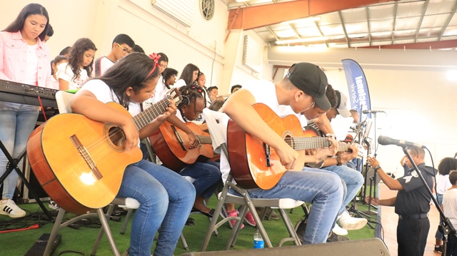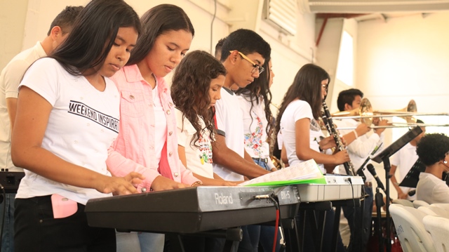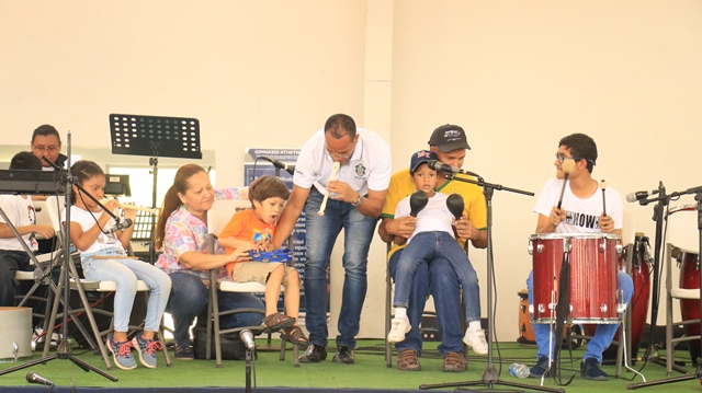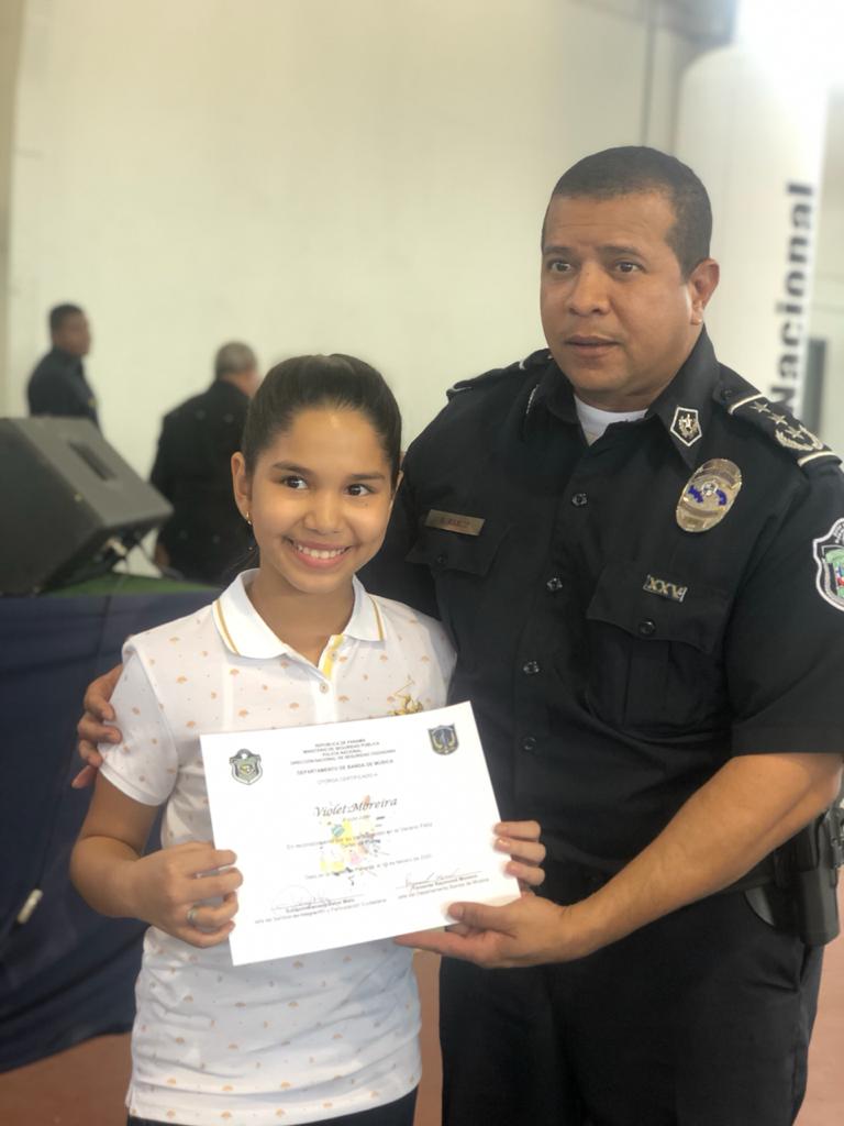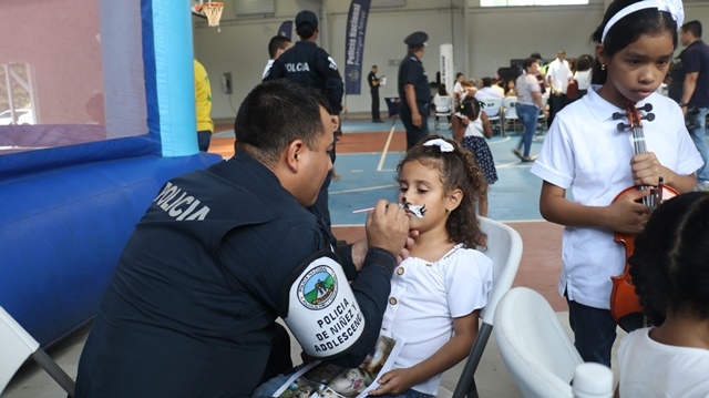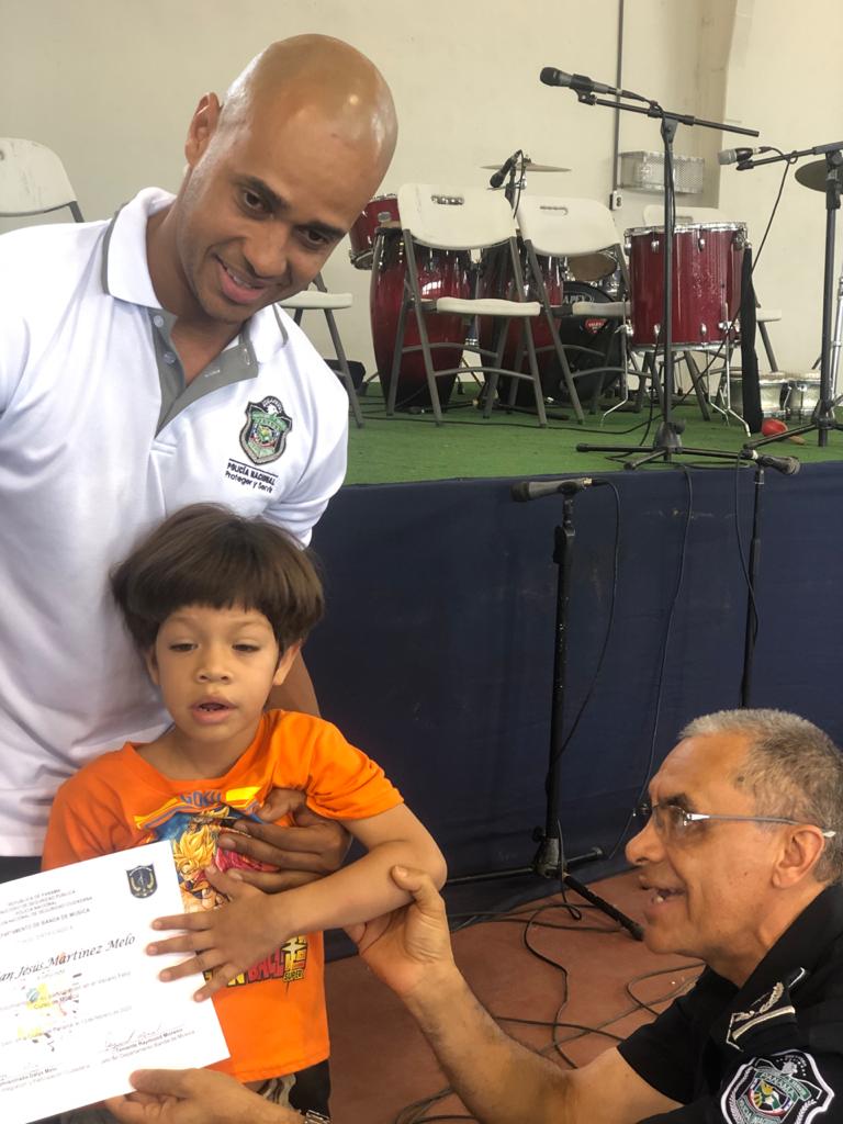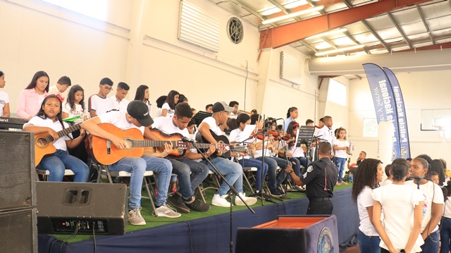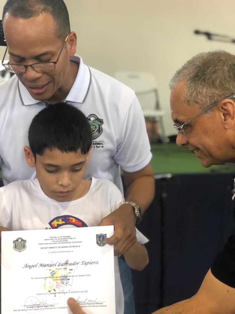 Un grupo de 85 niños, niñas y adolescentes, hijos de miembros de la Policía Nacional, demostraron su talento al culminar el programa de Verano Feliz Musical, que lleva a cabo la institución a través de la Banda de Música. Un concierto acompañado de un show artístico en el gimnasio Atheyna Baylon, ubicado en Ancón, fue preparado para que padres de familias disfrutaran de lo aprendido por sus hijos durante el mes que duró el curso. El punto más esperado fue la participación del grupo de niños con capacidades especiales, quienes demostraron sus dotes musicales llevándose el aplauso de los presentes. Canciones como: Calma de Pedro Capó y Farruko, Lo que dice que soy, Madre Tierra, fueron algunas de las interpretaciones de estos pequeños artistas. La comisionada Dalys Melo, jefa del Servicio Policial de Integración y Participación Ciudadana junto a miembros del directorio policial hicieron entrega de los certificados de participación. Los estudiantes recibieron clases de saxofón, violín, piano, trompeta y trombones, desarrollando en ellos el arte de la música. Dentro del curso los instructores, reforzaron los valores, la importancia de la disciplina, entre otros temas, que contribuyen a fortalecer su formación integral.