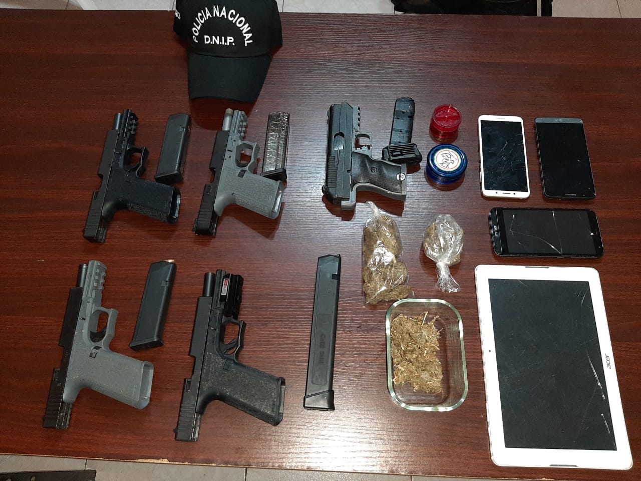Cinco armas de fuego, dinero en efectivo, aparatos tecnológicos, sustancias ilícitas e implementos para su embalaje fueron decomisados este viernes 14 de agosto, por unidades de la Dirección Nacional de Inteligencia Policial, en asocio con la Fiscalía de Drogas de San Miguelito. Las armas de fuego tipo pistolas 9mm, con 5 proveedores y municiones, fueron incautadas durante diligencia de allanamiento en el sector de Puente del Rey, barriada San Antonio, distrito de San Miguelito, donde un hombre de 20 años, fue aprehendido por este hecho. El detenido, quien fue presentado ante un Juez de Garantías, fue condenado a 20 años de prisión, por lo que fue puesto a órdenes del Sistema Penitenciario. |