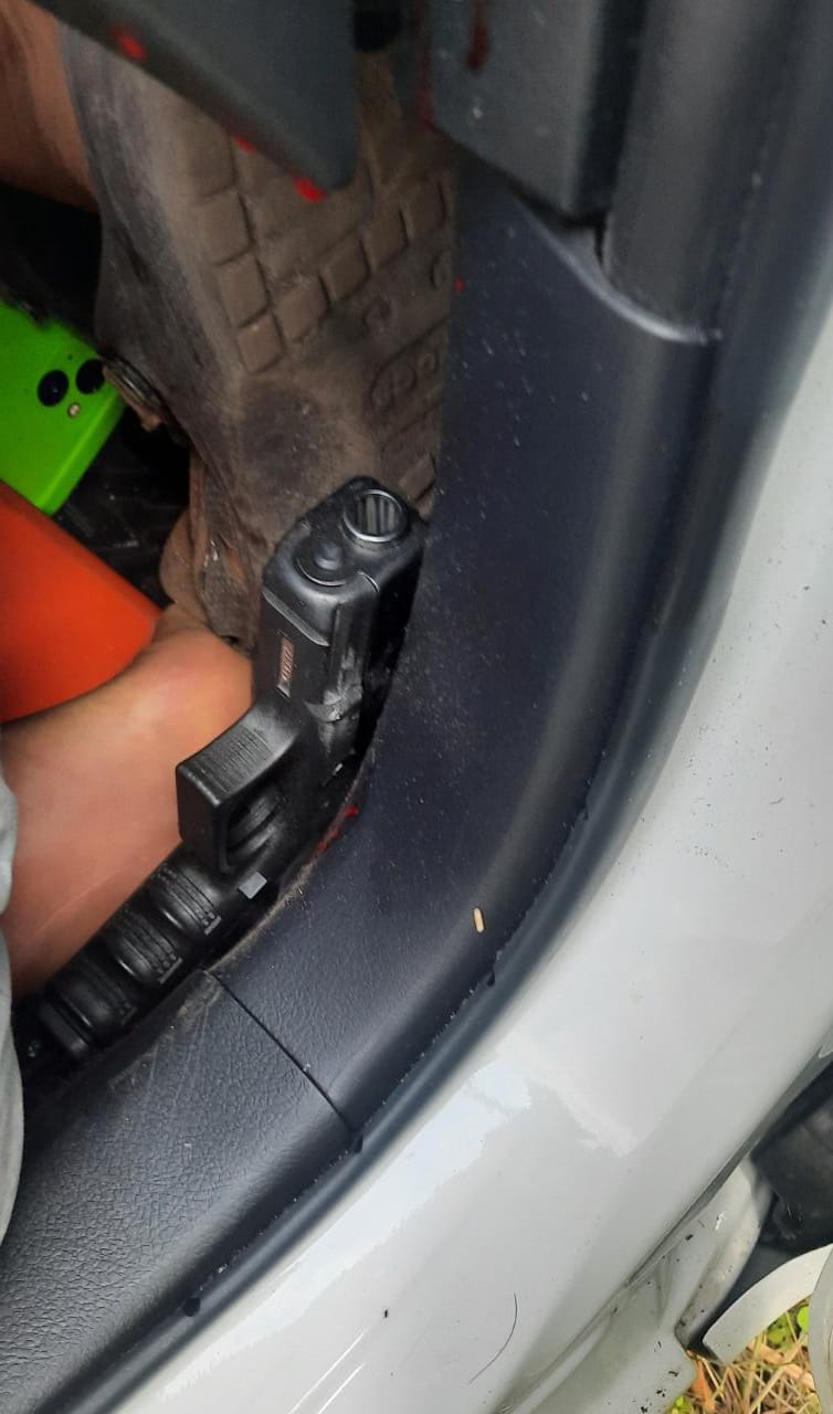 Al llegar al lugar personal de la Policía Nacional y criminalística para el levantamiento de los cuerpos ubicaron dentro del auto un arma de fuego tipo pistola.