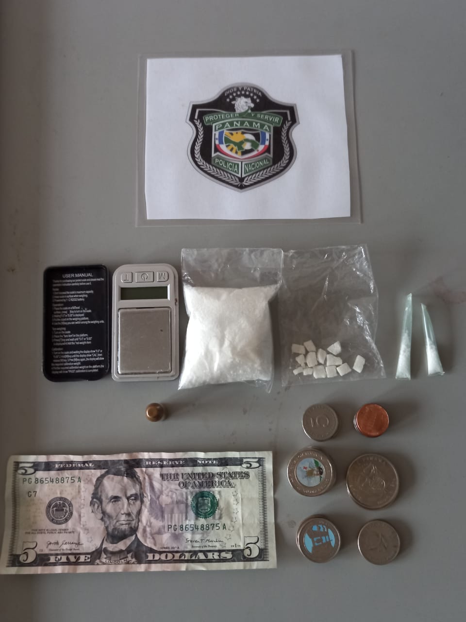 El subcomisionado Víctor Arauz, ejecutivo de la Zona Policial de Pacora, señaló que también fue aprehendido alias “Papaya” con una bolsa plástica transparente que en su interior contiene polvo blanco se presume sea cocaína, un sobre plástico transparente con sustancia Ilícita, varios fragmentos de color blanco que se presume sea sustancia ilícita (piedra) y una pesa digital de color gris.