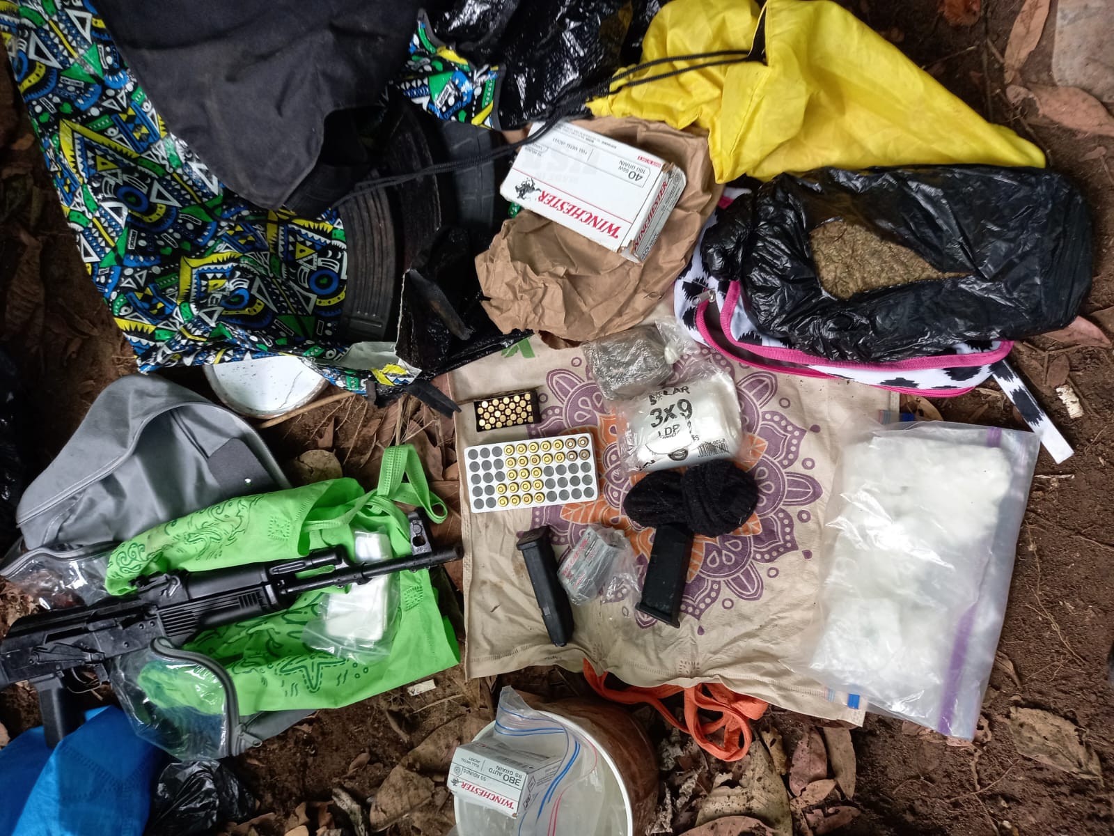 Las diligencias de allanamiento desarrolladas en el sector 1, las unidades policiales aprehenden en flagrancia a un ciudadano de 21 años con un arma tipo fusil (AK-47), 353 municiones de diversos calibres, tres proveedores, un paquete rectangular contentivo de hierba seca y dos chalecos antibalas de color negro.