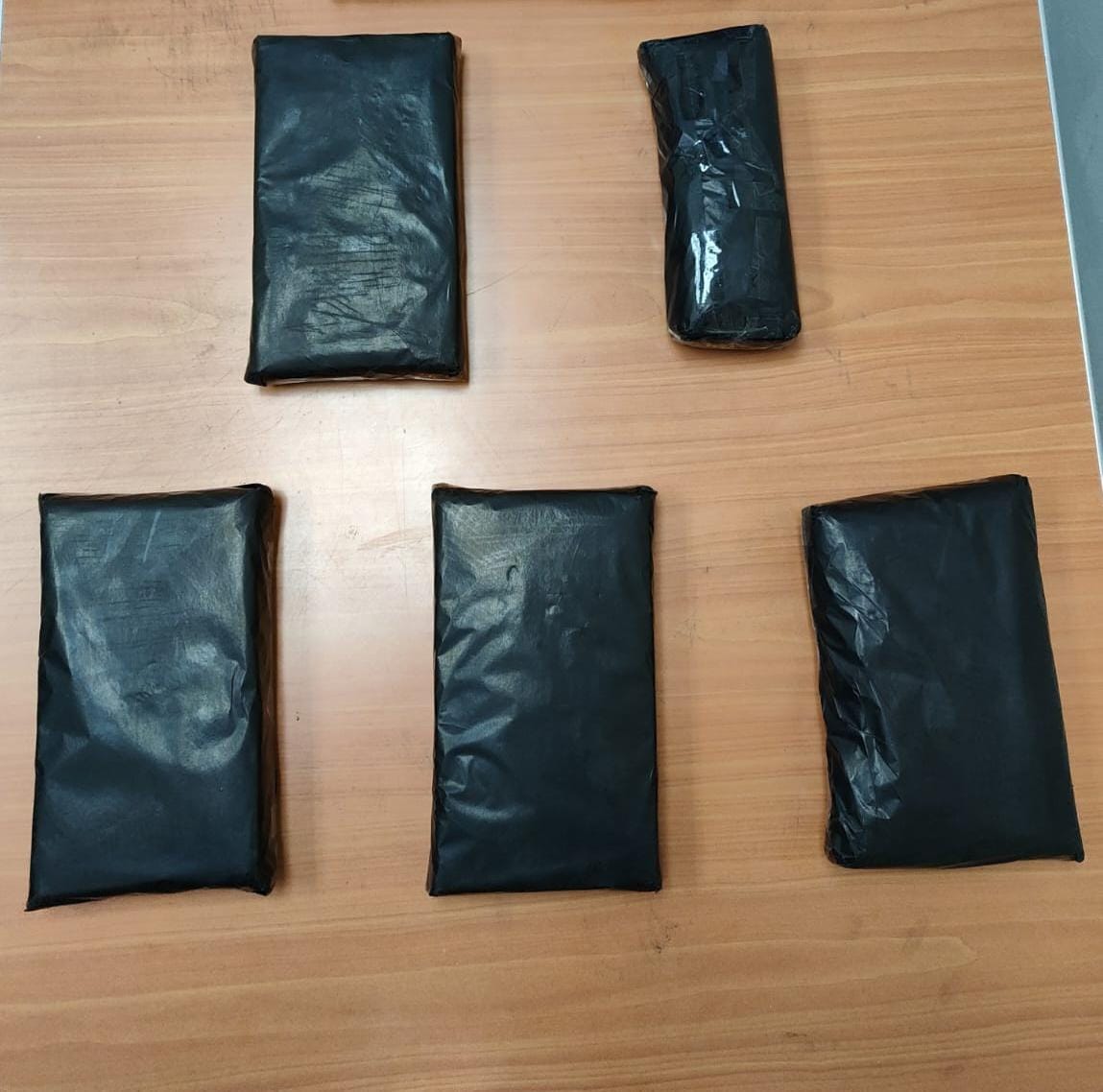 El hombre y una mujer de nacionalidad panameña, quienes viajaban en un vehículo tipo taxi, al momento de ser verificados con las unidades caninas se les encontraron cinco paquetes rectangulares, forrados con cinta adhesiva de color negro con posible Droga.