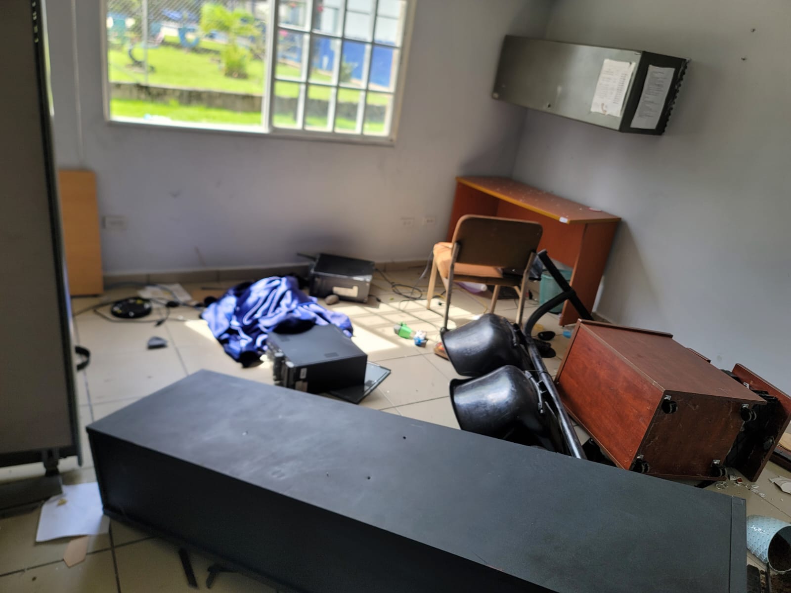Durante las protestas registradas en horas de la noche de ayer y madrugada de hoy, la Policía Nacional atendió casos de hurtos, daños a la propiedad privada además de actos de vandalismo, que culminaron con cuatro unidades policiales lesionadas. Se reportó el hurto de dinero en efectivo que se mantenía en el área de secretaría, luego de violentar y romper una puerta de vidrio para accesar a la oficina de una de la institución. Entre los daños a equipos tecnológicos se encuentran 22 computadoras, dos impresoras, routers, teléfonos, monitor de cámaras, aires acondicionado, cámaras de video vigilancia , teléfonos inalámbricos y fax También se incluyen puertas de vidrio y de madera, así como ventanas francesas, vidrios grandes, sofá, tableros grandes de madera, cubículos divisores y un archivador. Entre los artículos hurtados se contabilizan un DVR de las cámaras de video vigilancia, un carné de policía, chaleco y gorra de la DIJ, uniforme táctico de la DIJ, uniforme de fatiga, botas y zambrón entre otros accesorios propios del servicio policial. |