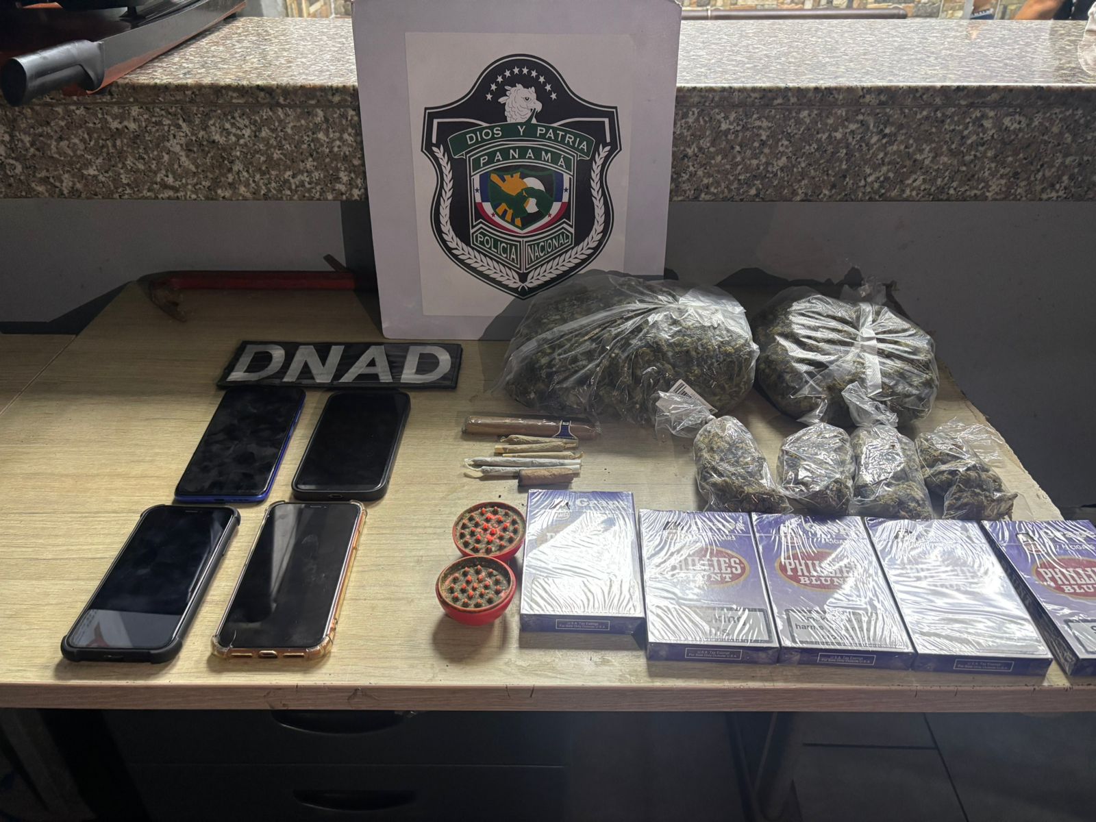 Siguiendo los lineamientos del plan firmeza la Policía Nacional en coordinación con el Ministerio Público, desarticuló un centro de Microtráfico en el sector de San Pedro #1 del corregimiento de Juan Díaz. La acción se dio luego de una diligencia de allanamiento y registro donde se aprehendieron a cinco personas de 18, 19, 21, 23 y 27 años de edad respectivamente. Entre los indicios recabados se encuentra dos bolsas plásticas transparentes y tres bolsitas plásticas transparente, con hierba seca marihuana. También se decomisaron cigarrillos de fabricación casera y cinco cajetitas de cigarrillos, un triturador, con residuo de hierba seca y cuatro teléfonos celulares. Los aprehendidos junto a los indicios fueron remitidos ante las autoridades judiciales. |