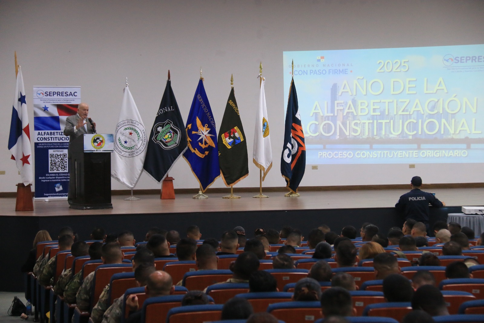 La Secretaría Presidencial para la Reorganización del Estado y Asuntos Constitucionales, en coordinación con el Ministerio de Seguridad Publico, realizó la primera jornada de “Alfabetización constitucional”, dirigida a miembros de los estamentos de seguridad, bajo el lema “Un reto colectivo de la sociedad para darse un futuro con seguridad y justicia”. Esta actividad, desarrollada en el auditorio del Instituto Superior Policial “Presidente Belisario Porras”, fue impartida por el Lic. Miguel Antonio Bernal Villalaz, a más de 400 unidades policiales; señalando que la finalidad de capacitarles es: “Habilitar de manera integral la participación de las unidades, con el fin de ser entes multiplicadores de la información, tanto en su área laboral, así como, con la sociedad en general. Con este tipo de capacitaciones, la Policía Nacional refuerza su compromiso con el respeto a los derechos humanos y la legalidad, pilares esenciales para el buen desempeño de sus funciones y la confianza ciudadana. |