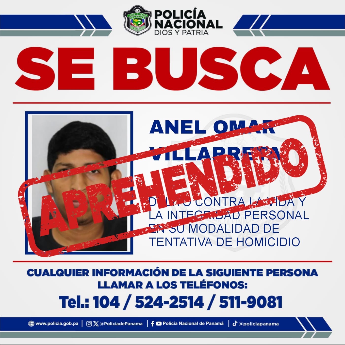 Mediante acciones operativas desplegadas en la provincia de Colón, la Policía Nacional dio con la aprehensión de Anel Omar Villarreta alias "Neno", quien figura como uno de los más buscados por el delito contra la vida y la integridad personal en su modalidad de tentativa de homicidio. De acuerdo a las investigaciones que adelantan la Fiscalía Regional de Colón y Guna Yala, Villarreta presuntamente se relaciona a una investigación tentativa de homicidio ocurrido el 10 de mayo de 2025 en el corregimiento de San Juan. Su aprehensión se dio en el corregimiento de Cristóbal, siendo trasladado para los trámites correspondientes |