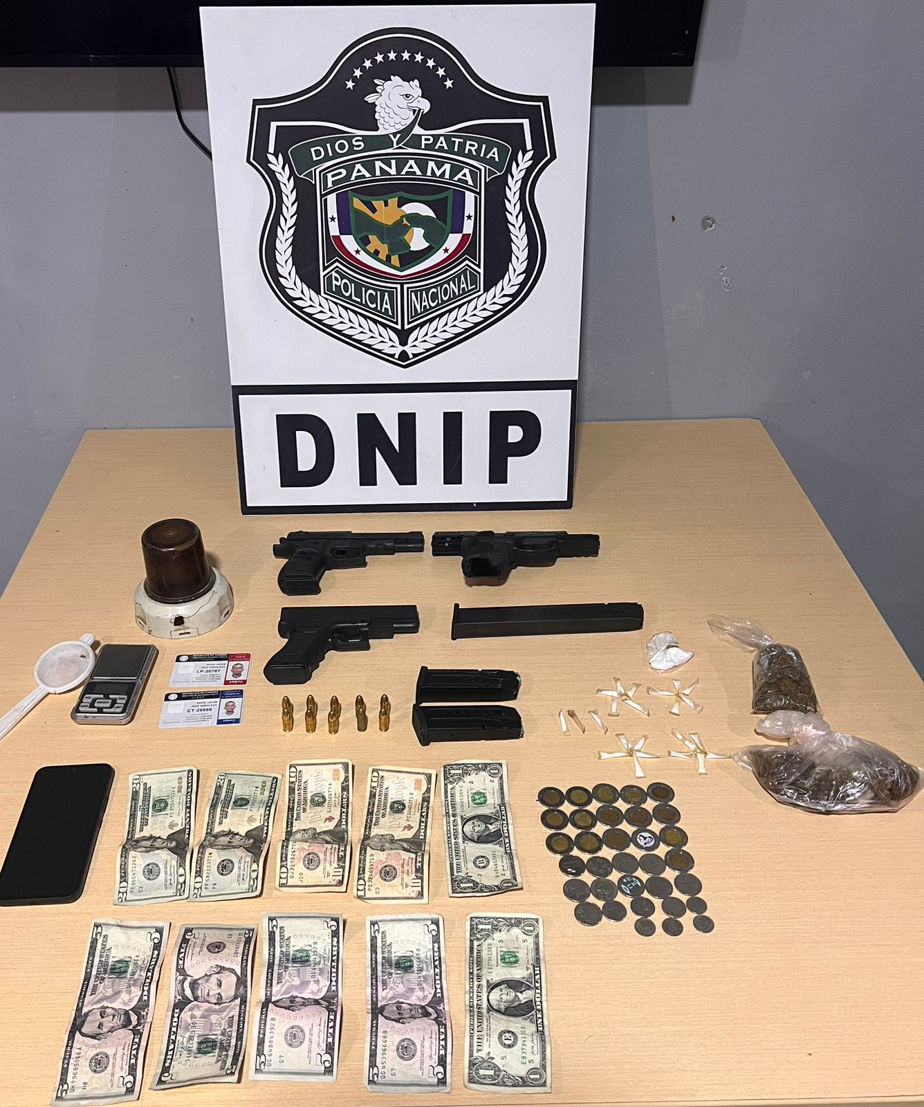 Durante la acción policial, en unas de las habitaciones se ubico un arma de fuego y dos réplicas de arma de fuego, diez municiones, tres proveedores, veintitrés trozos de carrizos con polvo blanco se presume sea cocaína, un triturador, una pesa digital, tres bolsas con presunta sustancia ilícita, y ciento un balboa con cinco centavos en efectivo.