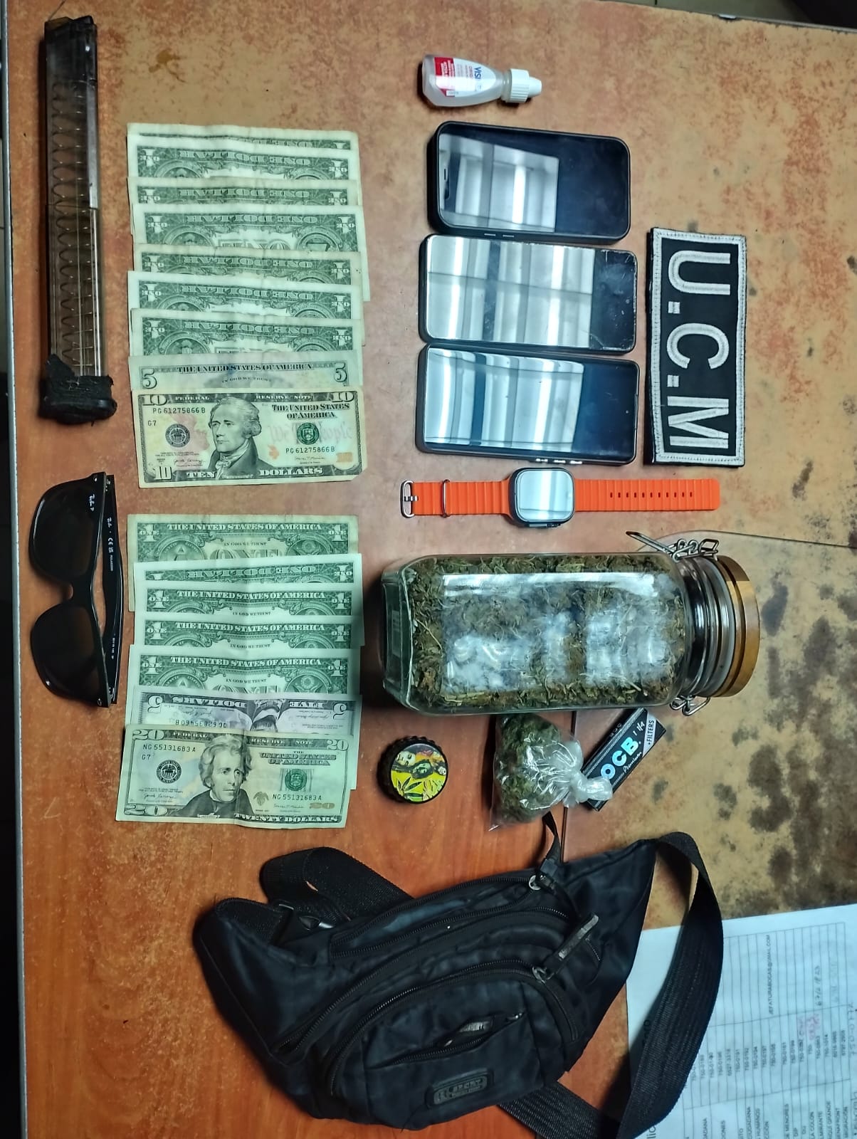 En medio de las diligencias de allanamiento bajo los lineamientos del Plan Firmeza se le ubicó: un arma de fuego, un proveedor color negro, 10 municiones calibre 9mm, un frasco de vidrio con presunta droga conocida como marihuana, una bolsa plástica con polvo blanco presunta cocaína, una pesa digital, cierta cantidad de dinero en efectivo y teléfonos celulares.