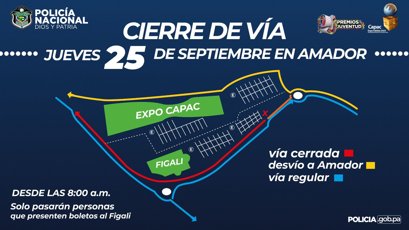Un total de 50 unidades uniformadas de la Dirección Nacional de Operaciones de Tránsito de la Policía Nacional, realizarán los desvíos y agilizarán el tráfico, en las principales vías de la Calzada de Amador, durante la celebración de Los Premios Juventud en el Centro de Convenciones de Amador, reveló el Teniente Joel Gaitán.