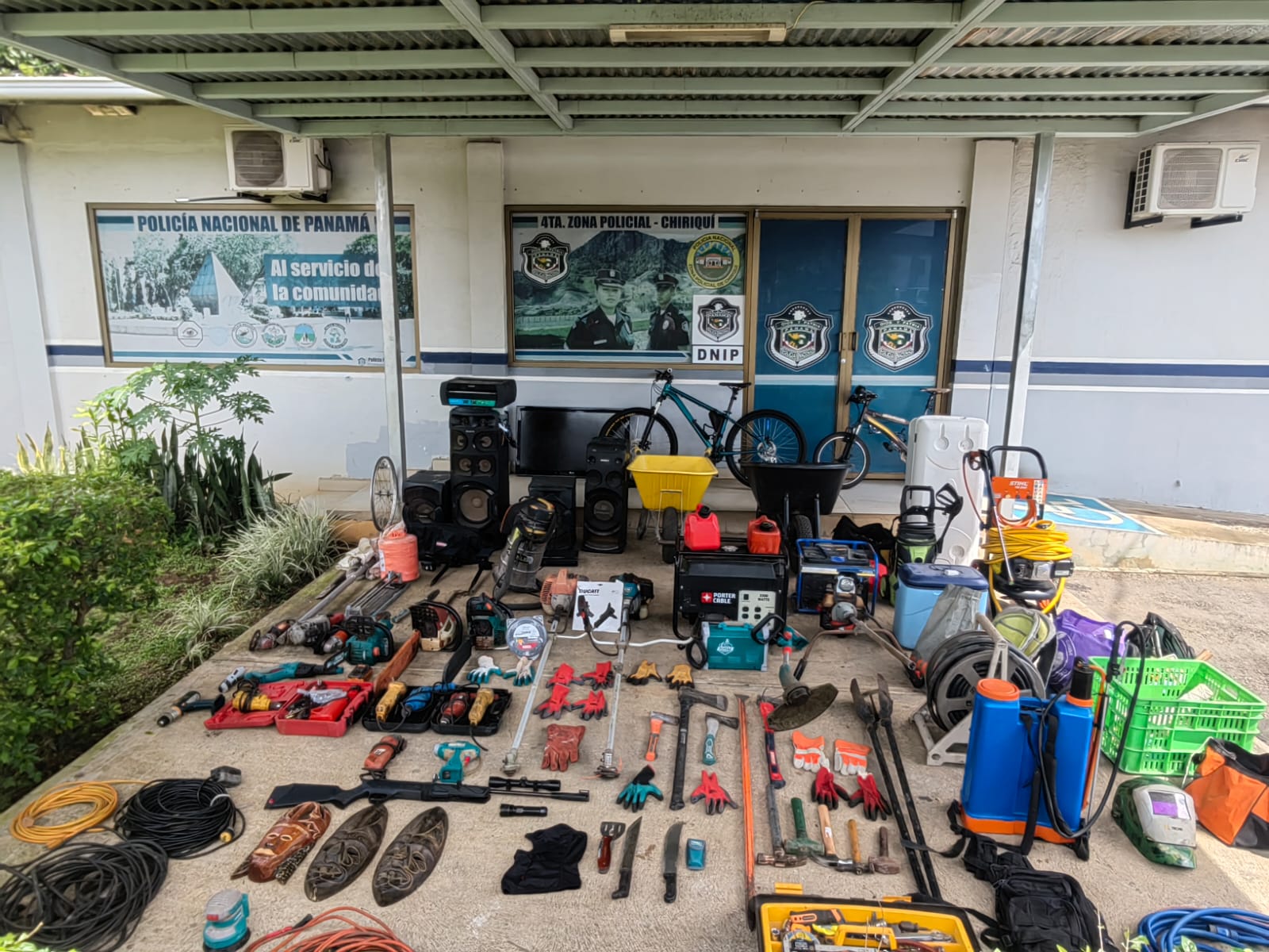 Adicionalmente, en diligencias realizadas en los corregimientos de Canta Gallo y La Concepción, se recuperaron generadores eléctricos, taladros, sopladores, flexibles, una prensa de hierro, marcos de madera, cortadoras de césped, equipos de sonido, carretillas, entre otros artículos. Todos estos objetos guardan presunta relación con denuncias por delitos contra el patrimonio económico.