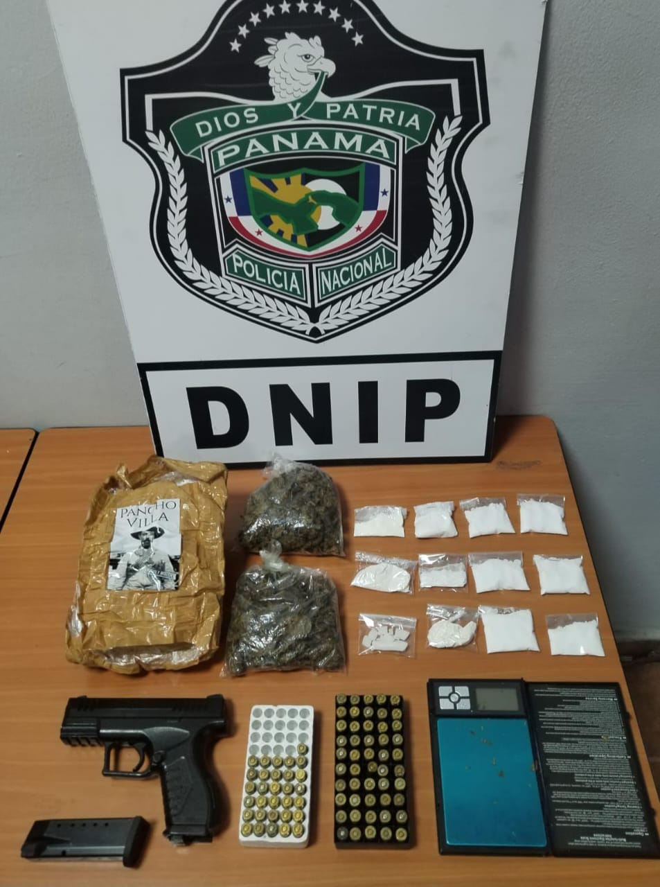 Durante el operativo, las autoridades decomisaron presunta sustancia ilícita que estaba en posesión del aprehendido. Además, en el mismo sector se ubicó una réplica de arma de fuego, varios sobres con contenido que se presume también sea sustancias ilícitas, municiones, una pesa digital y material de embalaje.