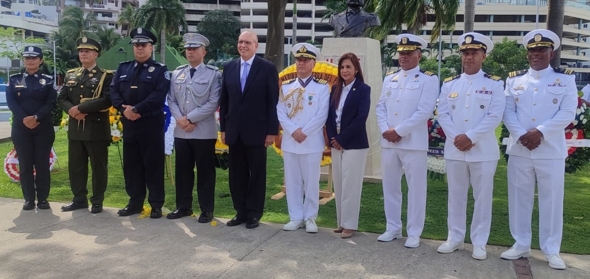 En conmemoración del Día de la Marina de Guerra del Perú, se realizó la ceremonia y entrega de una ofrenda floral en honor al Almirante Miguel Grau Seminario, en la Embajada del Perú, ubicada en la Plaza de la Democracia.