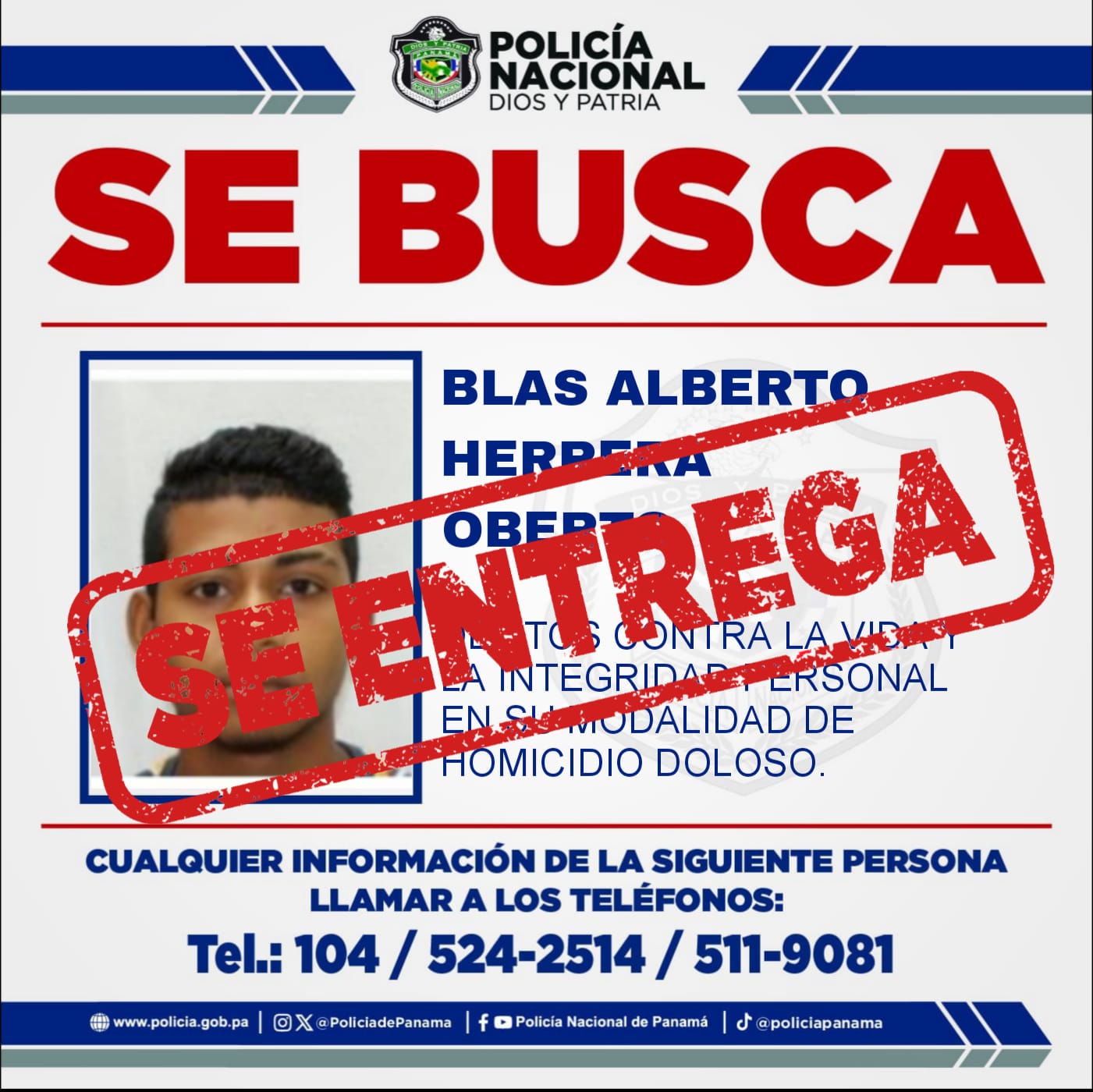 Tras coordinaciones con la Sección de Homicidio y Femicidio de la Fiscalía Metropolitana, la Policía Nacional hizo efectiva en el corregimiento de Ancón, la aprehensión de Blas Alberto Herrera Oberto, quien figura como uno de los más buscados por delito contra la vida y la integridad personal en su modalidad de homicidio doloso agravado.