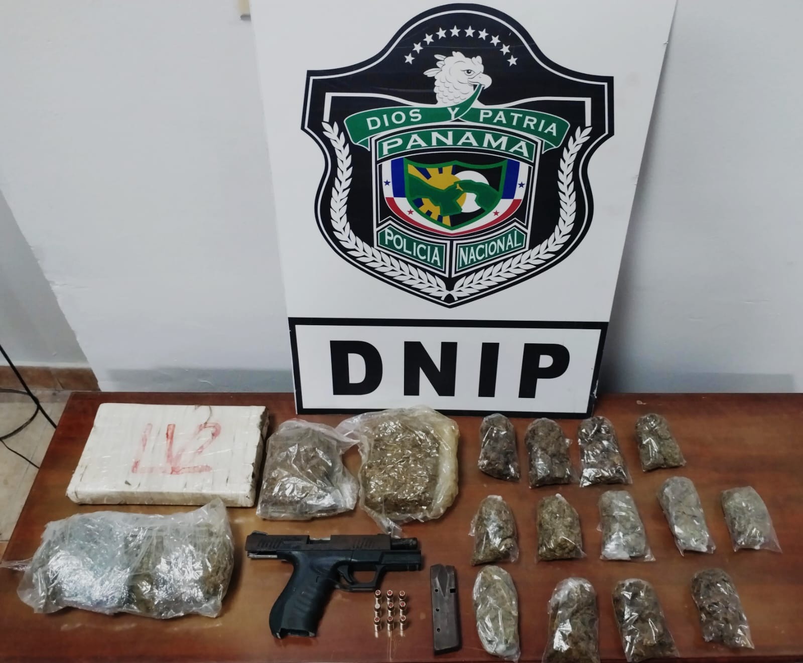 El hallazgo comprende 15 bolsas con hierba seca, que se presume sea la droga conocida como marihuana; un paquete rectangular, que se presume sea cocaína; y un arma de fuego tipo pistola, con su respectivo proveedor y municiones.