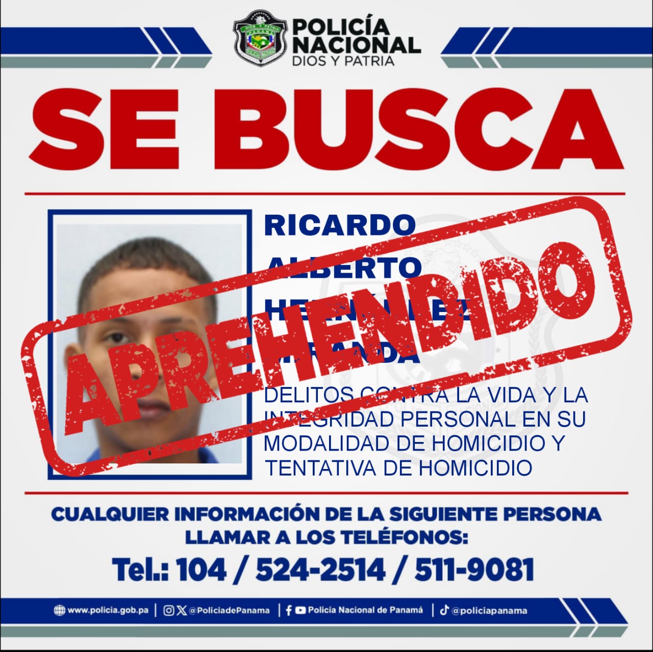 La Policía Nacional dio con la aprehensión de Ricardo Alberto Hernández Medina, uno de los más buscados por delitos contra la vida y la integrantes personal en su modalidad de homicidio y tentativa de homicidio.