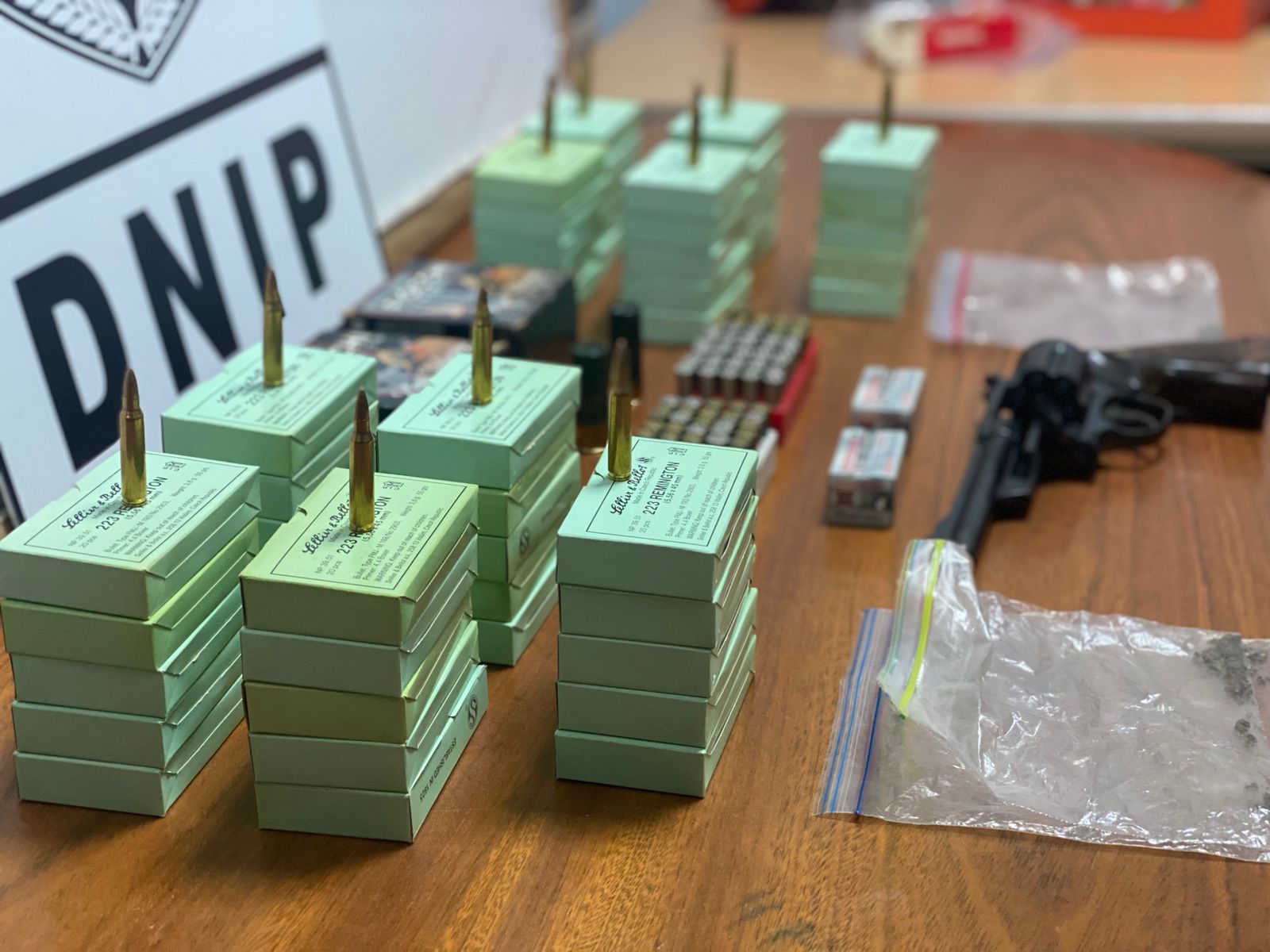 En la acción policial se incautaron mil municiones calibre 5.56 x 45, unas 5 cajas con municiones para arma de fuego calibres 22, 38, 357 y escopeta 12, un revólver calibre 357 con serie no visible, así como dos réplicas de arma de fuego (pellets).
