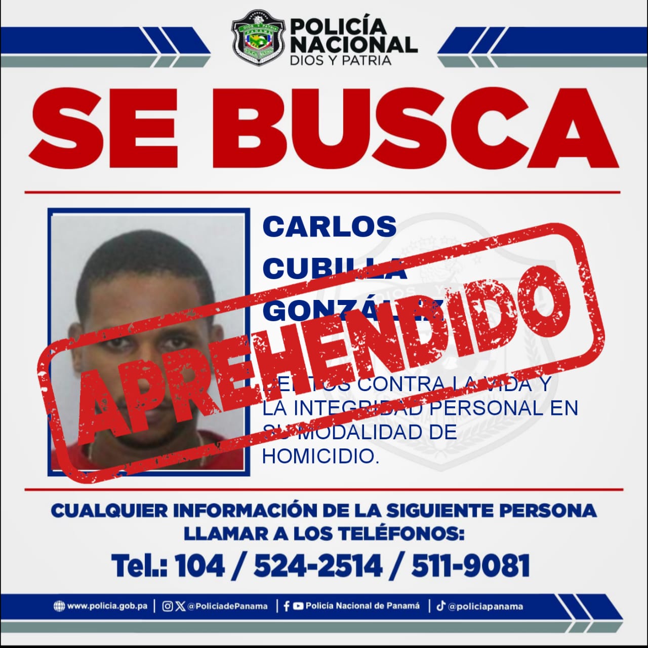 A través de acciones operativas desplegadas en la provincia de Colón, la Policía Nacional dio con la aprehensión de Carlos Cubilla González, quien figura como uno de los más buscados por el delito contra la vida y la integridad personal en su modalidad de homicidio doloso agravado.