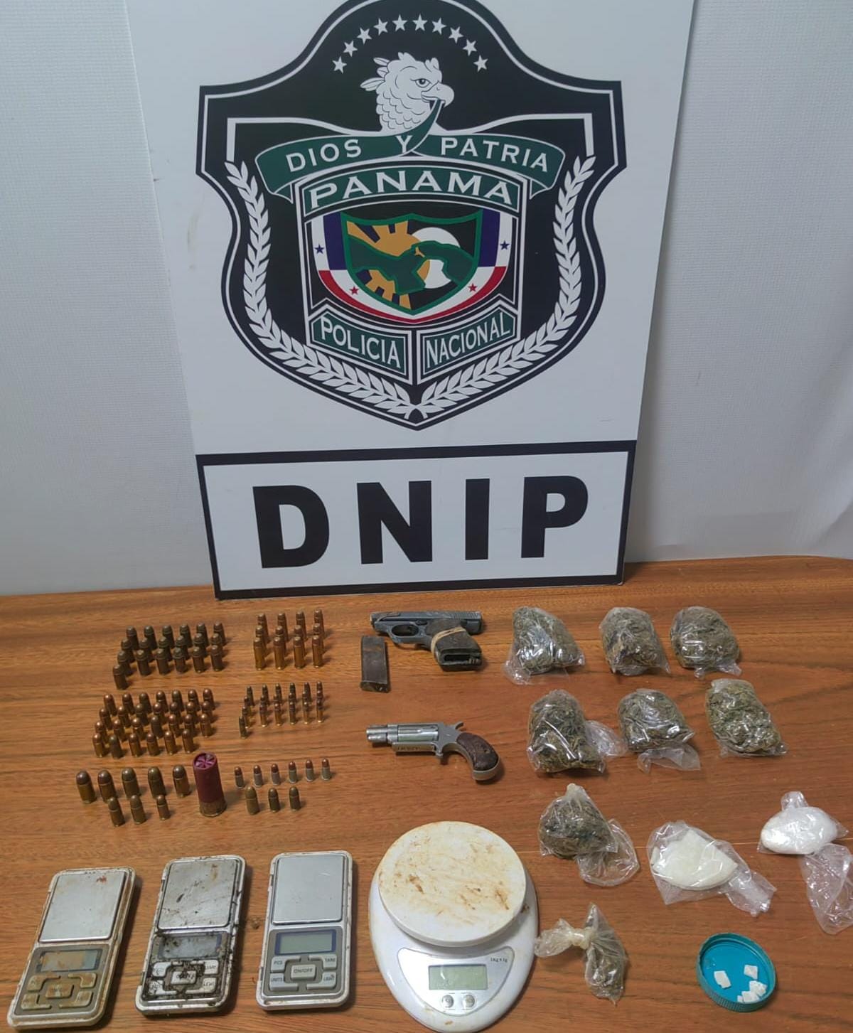 Durante la acción operativa, las autoridades decomisaron dos armas de fuego, municiones, varias bolsas con presunta sustancia ilícita, pesas digitales y otros artículos vinculados presuntamente a actividades delictivas.