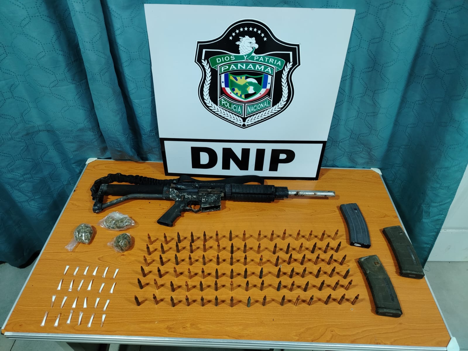Durante la acción se dio con el hallazgo de un arma de fuego tipo fusil, 90 municiones, tres proveedores, 24 carrizos con polvo blanco presuntamente cocaína y tres bolsas con hierba seca que se presume sea marihuana.