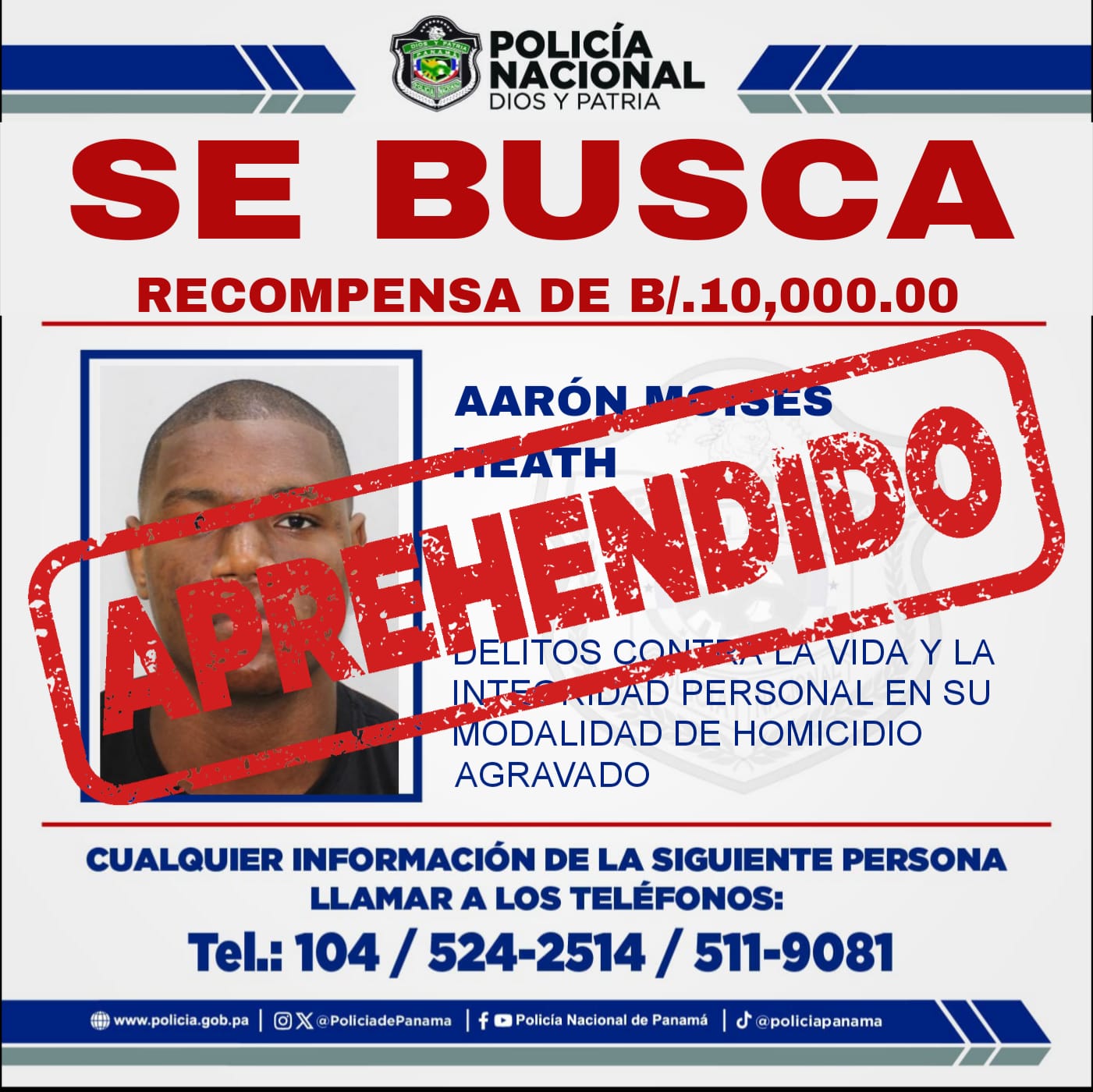 La Policía Nacional, en coordinación con el Ministerio Público, desarrollaron varias diligencias de allanamiento y registro en el corregimiento de Cativá, provincia de Colón, logrando la aprehensión de Aarón Moisés Heath, quien figuraba en la lista de los 33 más buscados con recompensa por el delito contra la vida e integridad personal, en la modalidad de homicidio agravado.