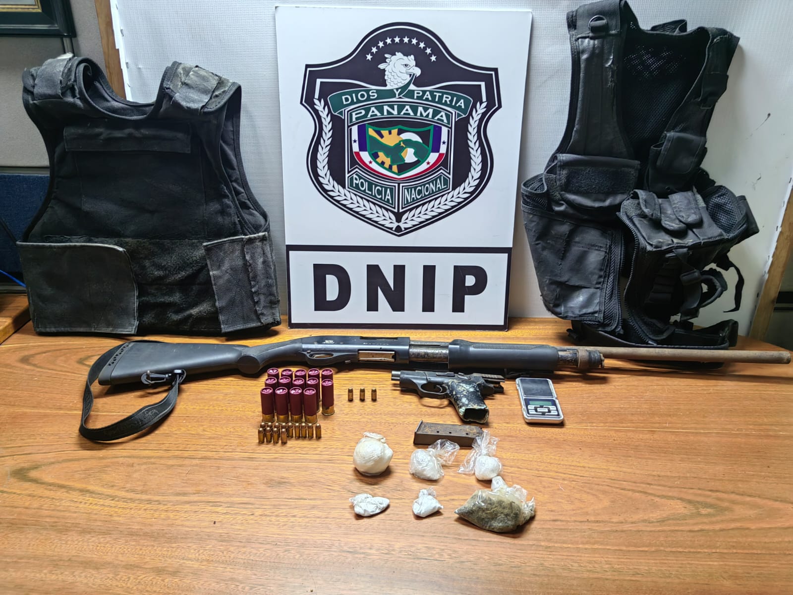Asimismo, en la verificación del sector se logró el hallazgo de dos armas de fuego (una pistola y una escopeta), 27 municiones, seis bolsitas con presuntas sustancias ilícitas (un polvo de color blanco y hierba seca), una pesa digital y dos chalecos balísticos y tácticos.
