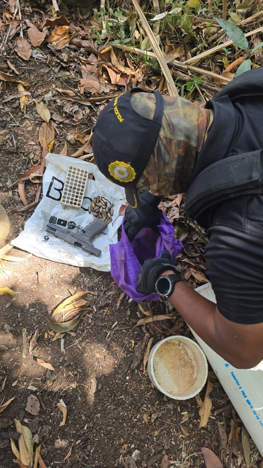 De igual manera, en este mismo sector en un lote baldío, se ubicó un arma de fuego tipo pistola, un proveedor y municiones.
